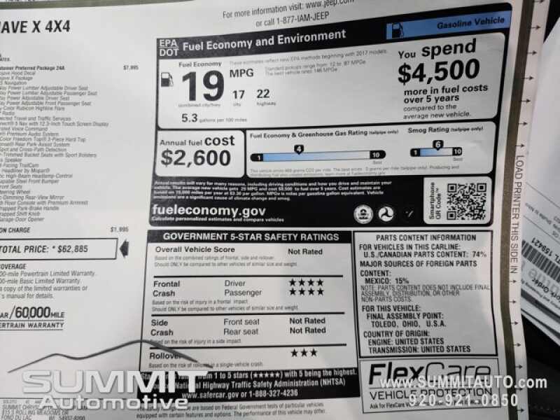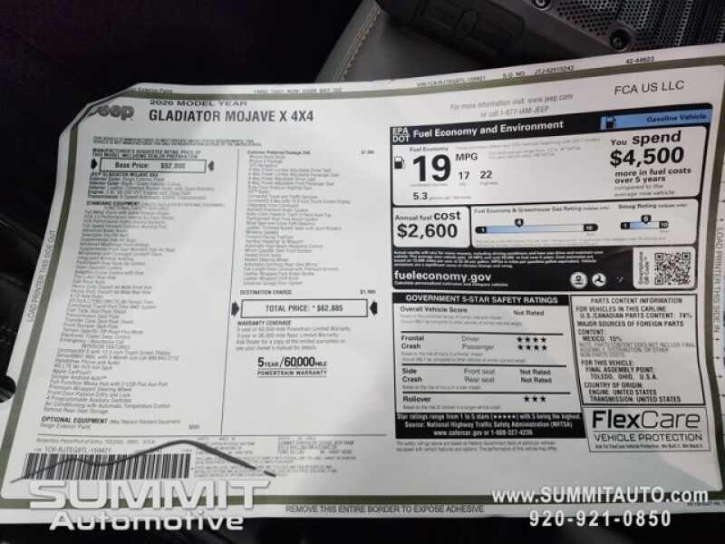 - QUICK ORDER PACKAGE 24A MOJAVE X -inc 3.6L V6 24V VVT UPG I Engine w/ESS 8-Speed Automatic 850RE Transmission Steel Front Bumper Integrated Off-Road Camera Blind Spot & Cross Path Detection Rear View Auto Dim Mirror Freedom Panel Storage Bag Rear Window Defroster Rear Sliding Window Heated Front Seats Bluetooth Wireless Speaker Integrated Voice Command w/Bluetooth Mojave Top Hood Decal Rock Protection Sill Rails Auto High Beam Headlamp Control Universal Garage Door Opener Heated Steering Wheel ParkSense Rear Park Assist System Steel Rear Bumper