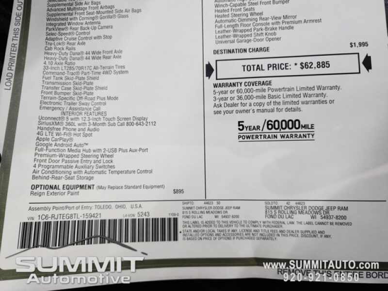 * Call Now! 1-(920)-921-0850 . Check out our Full inventory at www.SUMMITAUTO.com ! Summit Automotive Chrysler Dodge Jeep Ram in Fond du Lac, Wisconsin also Proudly Serving Oshkosh, Madison, Milwaukee, Sheboygan, Appleton, and Waupun is a family owned and operated dealership since 1959. We take great pride in our new and used car and truck center with vehicles to fit everyone's budget. We have ON THE SPOT FINANCING. BAD CREDIT OR GOOD CREDIT, we work with over 20 lenders to get you APPROVED AT THE MOST COMPETITIVE RATES. We provide AIRPORT TRANSPORTATION and NATIONWIDE DELIVERY OPTIONS. We are conveniently located on HWY 41 at EXIT 98, Hwy 151 at Military Rd. Exit . Just Look For The TRUCKS ON 41. Advertised price does not include, tax, title, registration and service fee.