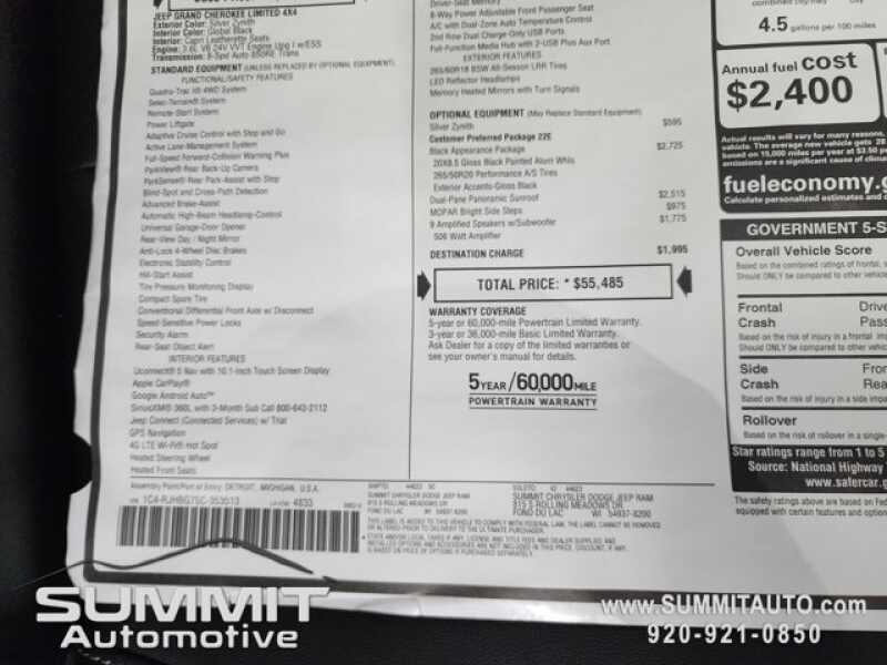 CLEAR PRICING. The pricing posted above is for everyone. TALK TO A SALESPERSON FOR YOUR PERSONALIZED PRICING. WE WILL SEARCH FOR THE LOWEST POSSIBLE PRICE AND HELP MAKE YOUR DECISION EASY. WE PAY TOP DOLLAR FOR ALL TRADES. We are WISCONSINS volume CHRYSLER, DODGE, JEEP, RAM dealer serving Fond du Lac, Sheboygan, Waupun, Oshkosh, Appleton, West Bend, Beaver Dam, Milwaukee, Madison and surrounding areas. We ship anywhere in the UNITED STATES.CALL NOW! 1-920-921-0850 !! Check out our Full inventory at www.SUMMITAUTO.com ! Summit Chrysler Dodge Jeep Ram in Fond du Lac, Wisconsin is a family owned and operated dealership since 1959. We take great pride in our new and used car and truck center with vehicles to fit everyones budget. We have ON THE SPOT FINANCING. BAD CREDIT OR GOOD CREDIT, we work with over 20 banks to get you APPROVED AT THE MOST COMPETITIVE RATES. We provide AIRPORT TRANSPORTATION and NATIONWIDE DELIVERY OPTIONS. We are conveniently located on HWY 41 at EXIT 98, Hwy 151 at Military Rd. Exit