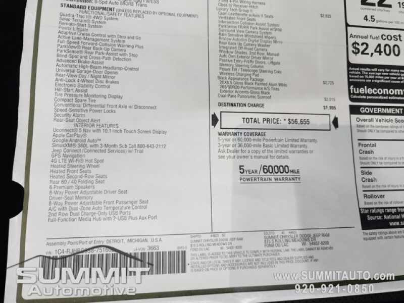 - LUXURY TECH GROUP II -inc Power Tilt/Telescope Steering Column Integrated Off-Road Camera Surround View Camera System Rain Sensitive Windshield Wipers ParkSense Front/Rear Park Assist w/Stop Front/Rear Doors & Liftgate w/Passive Entry Wireless Charging Pad Rear Back-Up Camera Washer Ventilated Front Seats Auto Dim Exterior Driver Mirror 2nd-Row Manual Window Shades Intersection Collision Assist System Rearview Autodim Digital Display Mirror Memory Steering Column