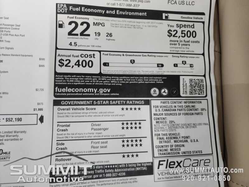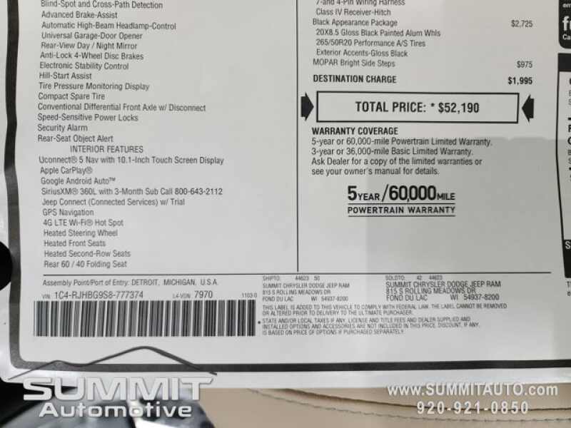 * Call Now! 1-(920)-921-0850 . Check out our Full inventory at www.SUMMITAUTO.com ! Summit Automotive Chrysler Dodge Jeep Ram in Fond du Lac, Wisconsin also Proudly Serving Oshkosh, Madison, Milwaukee, Sheboygan, Appleton, and Waupun is a family owned and operated dealership since 1959. We take great pride in our new and used car and truck center with vehicles to fit everyone's budget. We have ON THE SPOT FINANCING. BAD CREDIT OR GOOD CREDIT, we work with over 20 lenders to get you APPROVED AT THE MOST COMPETITIVE RATES. We provide AIRPORT TRANSPORTATION and NATIONWIDE DELIVERY OPTIONS. We are conveniently located on HWY 41 at EXIT 98, Hwy 151 at Military Rd. Exit . Just Look For The TRUCKS ON 41. Advertised price does not include, tax, title, registration and service fee.