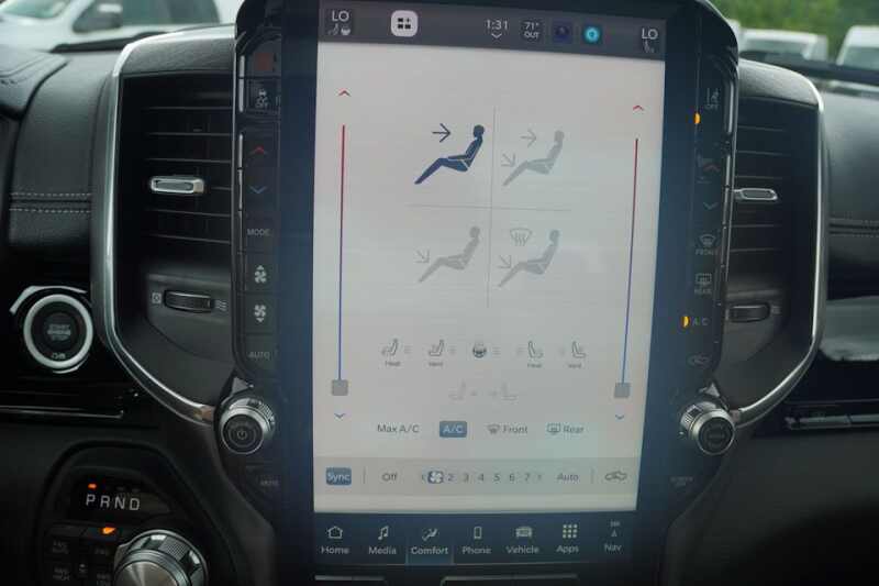 Advanced Multistage Front Air Bags * Supplemental Front Seat Mounted Side Air Bags * Supplemental Side Curtain Front and Rear Air Bags * Advanced Brake Assist * Electronic Shift On Demand Transfer Case * 3.55 Rear Axle Ratio * Active Lane Management System * Active Noise Control System * Adaptive Cruise Control with Stop and Go * Blind Spot and Cross Path Detection * Full Speed Forward Collision Warning Plus * ParkSense Front and Rear Park Assist * ParkView Rear Back Up Camera * Pedestrian Emergency Braking * Configurable Drive Mode * Class IV Receiver Hitch * Push Button Start * Remote Start System * Dampened Tailgate * 8 Way Power Adjustable Driver Seat * 8 Way Power Adjustable Front Passenger Seat * Radio / Driver Seat / Mirrors / Pedals Memory * Heated Front Seats * Ventilated Front Seats * Rear 60/40 Split Folding / Reclining Seat * Heated Second Row Seats * Uconnect 5 Nav with 12.0 Inch Touch Screen Display * SiriusXM 360L with 3 Month Sub Call 800 643 2112 * Ram Connect Connected Services with Trial * Cluster with 7.0 Inch TFT Color Display * Leather Wrapped Steering Wheel * Heated Steering Wheel * Power Adjustable Pedals with Memory * 9 Amplified Speakers with Subwoofer * A C with Dual Zone Auto Temperature Control * 2nd Row In Floor Storage Bins * Rear Under Seat Storage Compartment * 20 Inch x 9.0 Inch Premium Painted Polished Wheels *