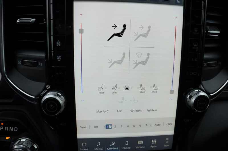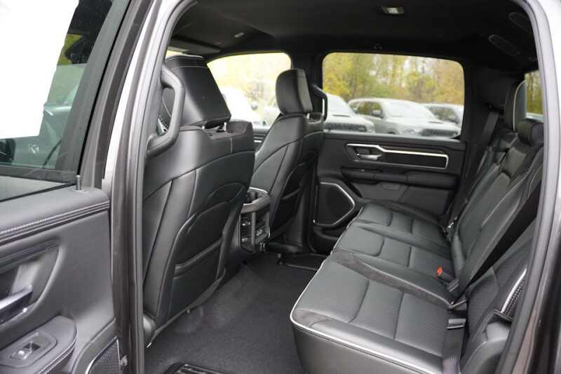 Advanced Multistage Front Air Bags * Supplemental Front Seat Mounted Side Air Bags * Supplemental Side Curtain Front and Rear Air Bags * Advanced Brake Assist * Electronic Shift On Demand Transfer Case * 3.55 Rear Axle Ratio * Active Lane Management System * Active Noise Control System * Adaptive Cruise Control with Stop and Go * Blind Spot and Cross Path Detection * Full Speed Forward Collision Warning Plus * ParkSense Front and Rear Park Assist * ParkView Rear Back Up Camera * Pedestrian Emergency Braking * Configurable Drive Mode * Class IV Receiver Hitch * Push Button Start * Remote Start System * Dampened Tailgate * 8 Way Power Adjustable Driver Seat * 8 Way Power Adjustable Front Passenger Seat * Radio Driver Seat Mirrors Pedals Memory * Heated Front Seats * Ventilated Front Seats * Rear 60/40 Split Folding Reclining Seat * Heated Second Row Seats * Uconnect 5 Nav with 12.0 Inch Touch Screen Display * SiriusXM 360L with 3 Month Sub * Ram Connect Connected Services with Trial * Cluster with 7.0 Inch TFT Color Display * Leather Wrapped Steering Wheel * Heated Steering Wheel * Power Adjustable Pedals with Memory * 9 Amplified Speakers with Subwoofer * A C with Dual Zone Auto Temperature Control * 2nd Row In Floor Storage Bins * Rear Under Seat Storage Compartment * 20 Inch x 9.0 Inch Premium Painted Polished Wheels * 275/55R20 All Season LRR Tires * 18 Inch Full Size Steel Spare Wheel * LED Low High Reflector Headlamps * Automatic High Beam Headlamp Control * LED Front Fog Lamps * Chrome Premium Power Mirrors * Automatic Power Folding Mirrors * Body Color Fender Flares *