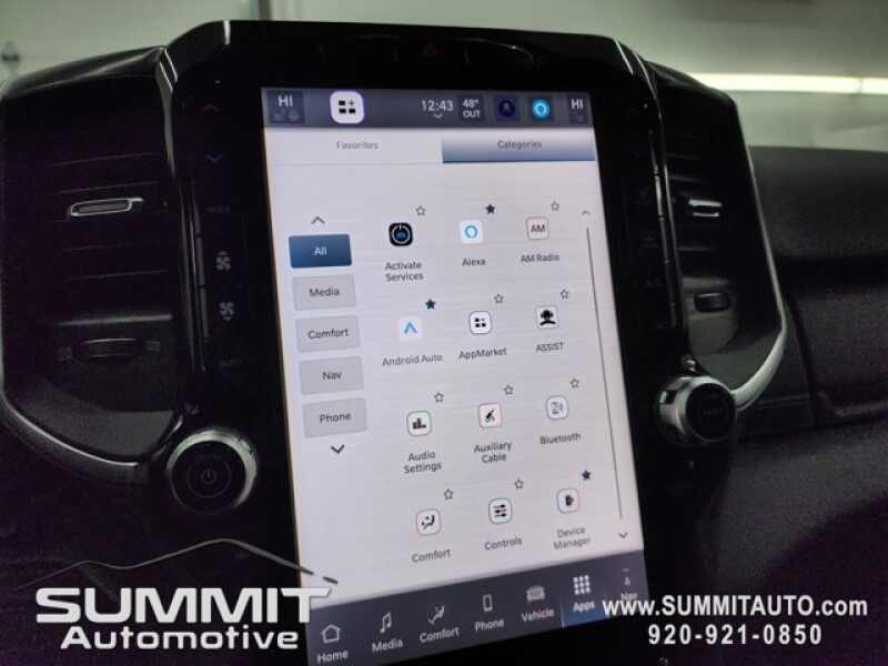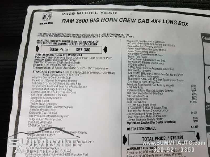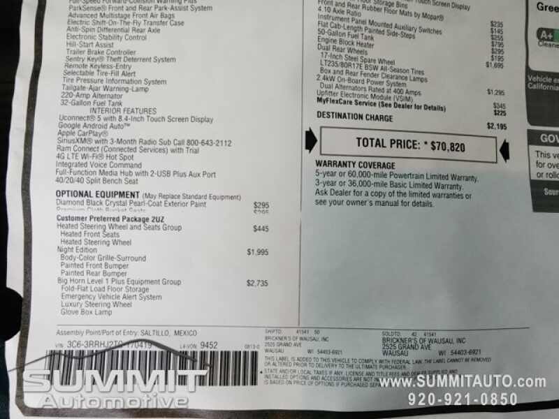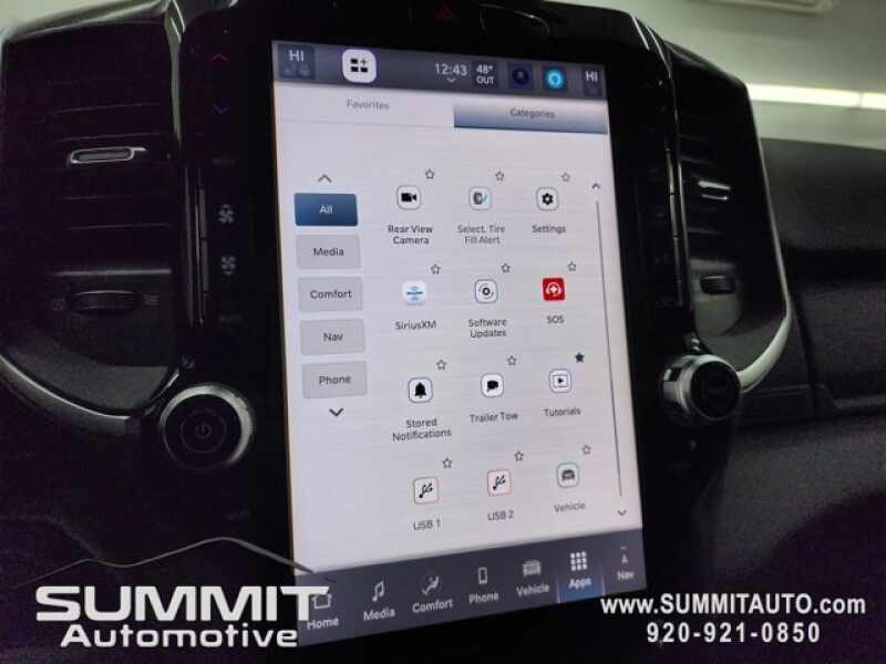 - BIG HORN LEVEL 1 PLUS EQUIPMENT GROUP -inc For Details Visit DriveUconnect.com For More Info Call 800-643-2112 Emergency Vehicle Alert System (EVAS) 12 Touchscreen Display Glove Box Lamp Auto Power-Folding Mirrors Footwell Courtesy Lamp MOPAR Deployable Bed Step Alexa Built-In Forward & Reverse Utility Lights Locking Lower Glove Box Remote Start System 9 Alpine Speakers w/Subwoofer Disassociated Touchscreen Display Dual Glove Boxes 2nd Row In Floor Storage Bins Rear View Auto Dim Mirror Rear Dome w/On/Off Switch Lamp LED Bed Lighting GPS Navigation SiriusXM w/360L Connected Travel & Traffic Services Foam Bottle Insert (Door Trim Panel) Big Horn IP Badge Off-Road Information Pages Trailer Tow Pages HD Radio Radio Uconnect 5 Nav w/12.0 Display Power Heated Fold Telescopic Mirrors Steering Wheel Mounted Audio Controls Air Conditioning ATC w/Dual Zone Control MOPAR Spray In Bedliner Luxury Steering Wheel Power Telescoping Mirrors