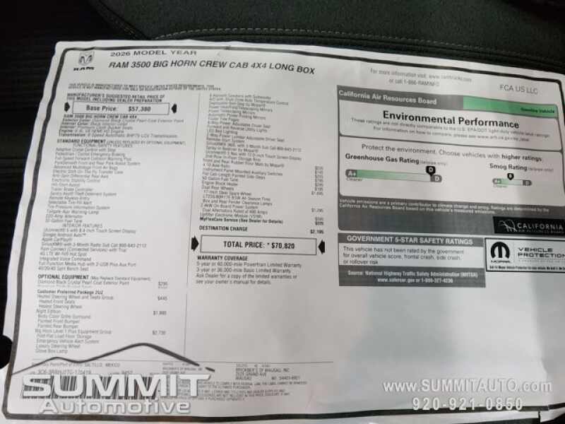 * Call Now! 1-(920)-921-0850 . Check out our Full inventory at www.SUMMITAUTO.com ! Summit Automotive Chrysler Dodge Jeep Ram in Fond du Lac, Wisconsin also Proudly Serving Oshkosh, Madison, Milwaukee, Sheboygan, Appleton, and Waupun is a family owned and operated dealership since 1959. We take great pride in our new and used car and truck center with vehicles to fit everyone's budget. We have ON THE SPOT FINANCING. BAD CREDIT OR GOOD CREDIT, we work with over 20 lenders to get you APPROVED AT THE MOST COMPETITIVE RATES. We provide AIRPORT TRANSPORTATION and NATIONWIDE DELIVERY OPTIONS. We are conveniently located on HWY 41 at EXIT 98, Hwy 151 at Military Rd. Exit . Just Look For The TRUCKS ON 41. Advertised price does not include, tax, title, registration and service fee.