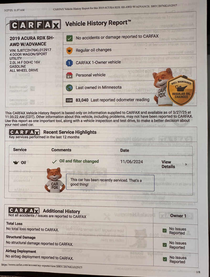 RDX SH-AWD Advance Pkg Sport Utility 4 cyl Turbo 2.0 liter VTEC Exceptionally clean inside and out. Look at a new one and then compare this one. All maintenance current. Michelin Defender series tires add to the smooth, quiet ride. All the safety and convenience electronics available in 2019.2019 is the first year of the new series. The next several years are nearly identical. (it looks newer than it is)Front page of CarFAx included in photos