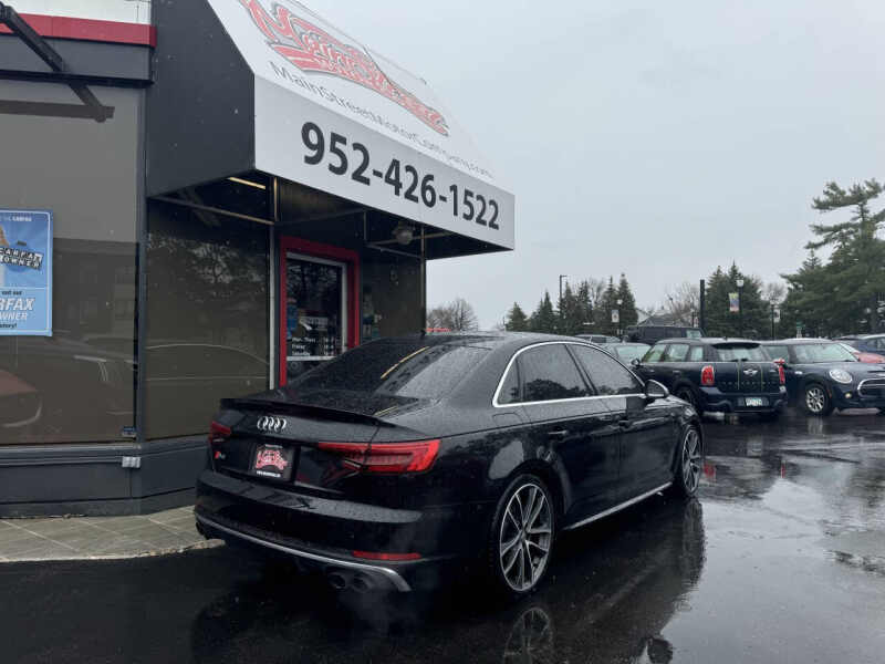 Get behind the wheel of this sleek and powerful 2018 Audi S4 3.0T quattro with just 89,491 miles, a clean title, no accidents, and all-wheel drive. Powered by a dynamic 3.0L V6 turbocharged engine, paired with an 8-speed automatic transmission, this sedan delivers both performance and luxury. The interior features leather seats, a sunroof, dual-zone climate control, and an intuitive infotainment screen with Bluetooth connectivity. Additional highlights include parking sensors, a rearview camera, keyless entry, and push-to-start, ensuring convenience and comfort on every drive. We offer easy financing, warranties, and nationwide shipping. Trades are welcome! Come visit us at 2021 Mainstreet, Hopkins, MN 55343 to experience this stunning Audi in person!