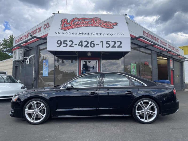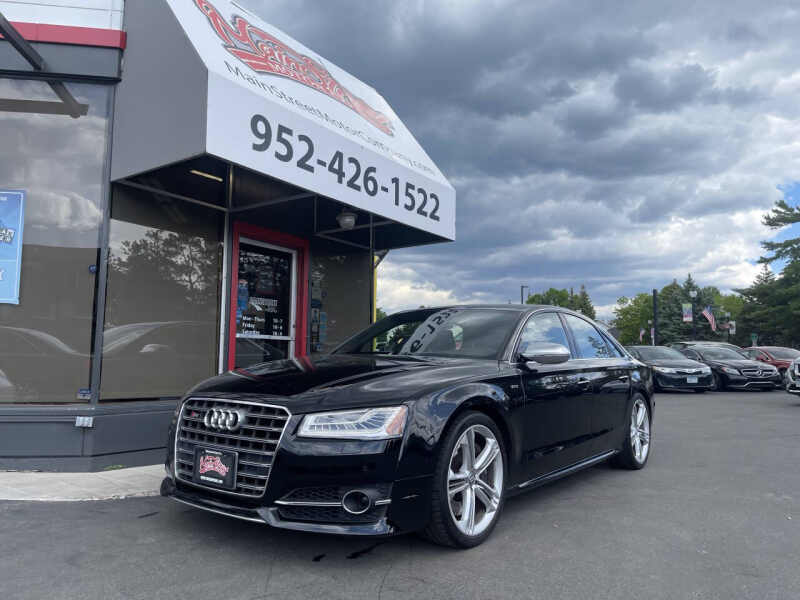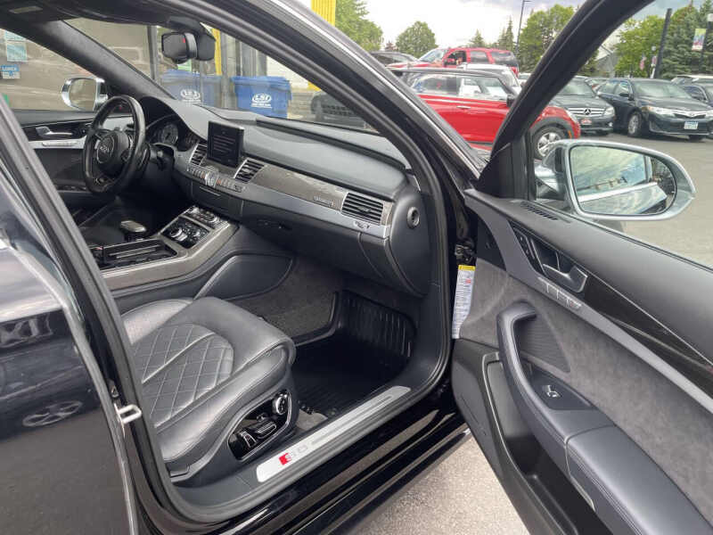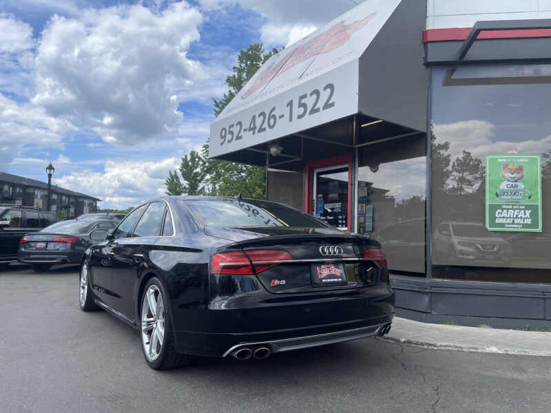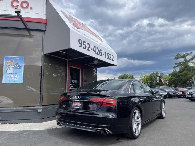 2018 Audi S8 4.0T quattro a high-performance luxury sedan powered by a commanding 4.0L V8 twin-turbocharged engine producing an exhilarating 605 horsepower. Paired with an 8-speed automatic transmission and Audis legendary quattro all-wheel-drive system, this S8 delivers blistering speed and precision handling with confidence. With just 65,165 miles, this rare performance sedan has a clean title, no accidents, and two previous owners. Loaded with upscale features including quattro all-wheel drive, adaptive air suspension, advanced driver assistance systems, a premium Bang & Olufsen sound system, navigation, leather and Alcantara interior, digital cockpit, and a panoramic sunroof, the S8 combines ultimate luxury with track-ready performance. We offer easy financing, available extended warranties, and nationwide shipping. Trades are welcome! Visit us at 2021 Mainstreet, Hopkins, MN 55343 to experience this extraordinary machine today.