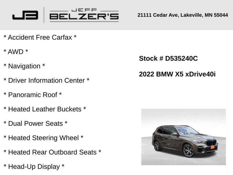 * Accident Free Carfax * AWD with Adaptive M Suspension * Navigation * Driver Information Center * Panoramic Sky Lounge LED Roof * Heated Leather Buckets * Dual Power Seats * Heated Steering Wheel and Armrests * Heated Rear Outboard Seats * Head-Up Display * Blind Spot * Rear Cross Traffic Alert * Lane Departure Warning * Bluetooth Hands Free * Cruise Control * 21 Inch Alloy Wheels * LED Tail Lamps * Icon Adaptive LED Headlights w/Laserlight * Auto High Beams * Rain Sensing Wipers * Keyless Open/Keyless Start * Power Liftgate * Automatic Park Assist * 4-Zone Automatic Climate Control * Rear Camera * Surround View Camera * Satellite Radio *