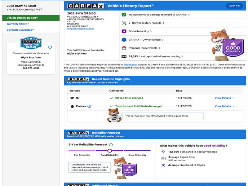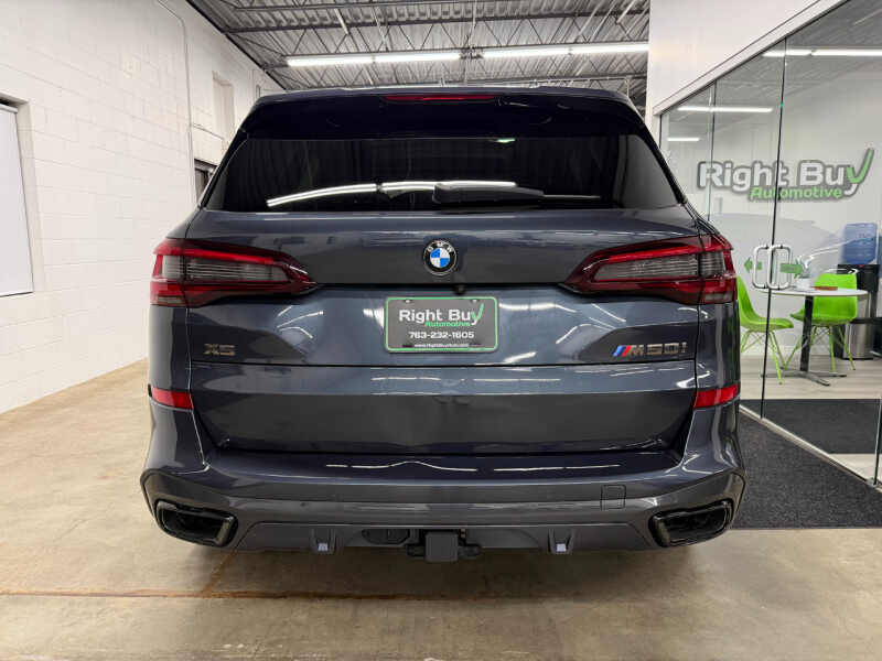 One Owner. Dealer maintained and serviced. Inspection performed. Full remaining factory warranty from BMW. Original MSRP $93,295. This 2022 BMW X5 M50i features a 4.4L TwinPower Turbo V8 Engine producing 523HP/553TQ. 8-Speed Automatic Transmission. xDrive All-Wheel Drive. Artic Grey Metallic Exterior. Black Extended Merino Leather Interior. Driving Assistance Professional Package. Parking Assistance Package. Premium Package. M Sport Package. 22 M Double-Spoke Bi-Color Wheels. M Sport Brakes with Red Calipers. M Sport Differential. M Sport Exhaust System. Adaptive M Suspension. Shadowline Exterior Trim. Extended Shadowline Trim. Heated Front Seats. Heated Rear Seats. Massaging Front Seats. Heated Steering Wheel. Ventilated Front Seats. 4-Zone Automatic Climate Control. Panoramic Moonroof. Ambient Lighting. Harman Kardon Surround Sound System. Live Cockpit Pro with Navigation. Head-Up Display. Wireless Apple CarPlay & Android Auto. Comfort Access Keyless Entry. Remote Engine Start. Soft-Close Doors. Rearview Camera. Carbon Fiber Interior Trim. Full LED Lights. Auto Dimming Mirrors. Rear Manual Side Window Shades. Wireless Charging. Trailer Hitch. Active Driving Assistant Pro with Steering and Lane Control Assist. Front and Rear Park Distance Control. Parking Assistant Plus with Surround View. Connected Package Pro. SiriusXM. Every Vehicle at Right Buy comes with a full inspection report. CarFax vehicle history report. Affordable extended coverage options and low-rate financing options. Set an appointment to view the vehicle in our heated indoor showroom. PRIME LEVEL 3 EXCLUSIONARY COVERAGE AVAILABLE 1 YEAR 12K MILES FOR $3,190 OR 5 YEAR 100K MILES FOR $4,484 OTHER TERMS AVAILABLE.