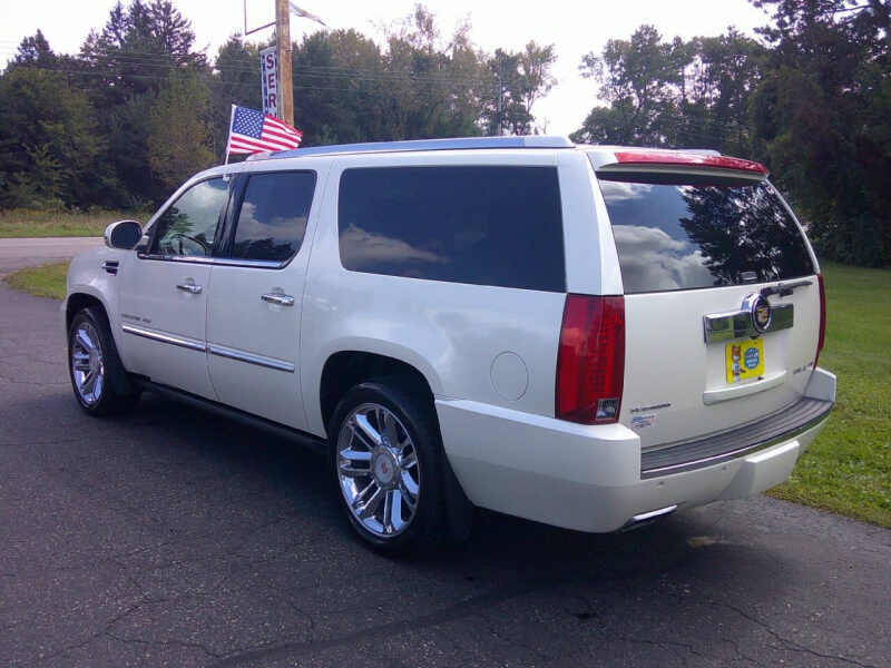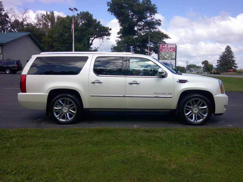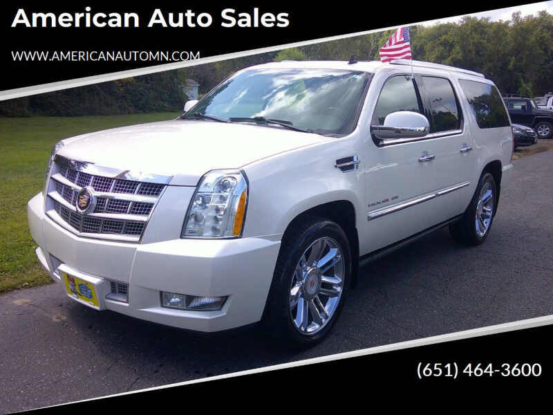 If you want to haul the family in total luxury but don't want to spend 6 figures on a new one look no further than this loaded Escalade ESV Platinum. This low millage beauty has it all like 22 chrome wheels with brand new tires, heated and cooled front seats, heated steering wheel, heated 2nd row bucket seats, 4 DVD screens, power tailgate, 3 zone automatic climate control, Bose 9 speaker 5.1 surround sound, leather wood and chrome dash, heated and cooled cup holders, remote start, backup camera, Bluetooth for phone, AUX and USB inputs, LED headlights and taillight, power glass moon roof, Blind spot monitor, power tailgate, and so much more. We have great financing with low monthly payments. Call us now American Auto Sales 651-464-3600. WE NEED YOUR TRADES!!! Nosotros hablamos espaol