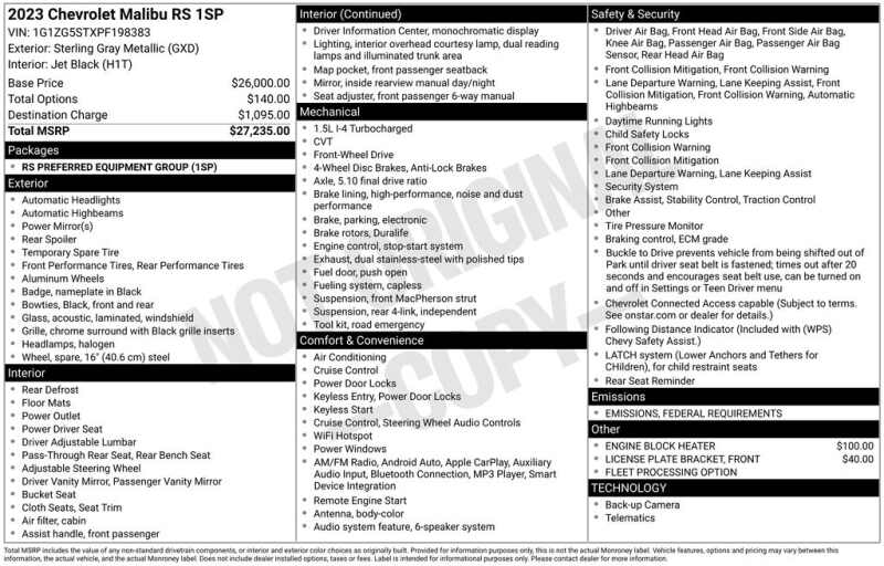 Priced below KBB Fair Purchase Price! 2023 Sterling Gray Metallic Chevrolet Malibu RS CARFAX One-Owner. Clean CARFAX.