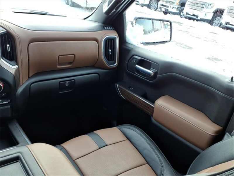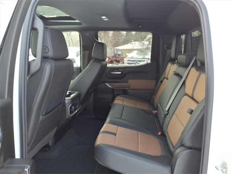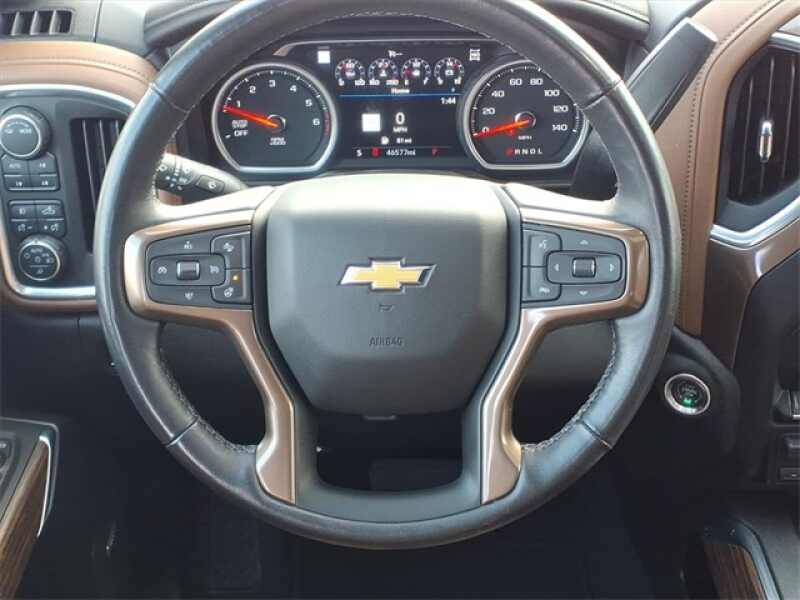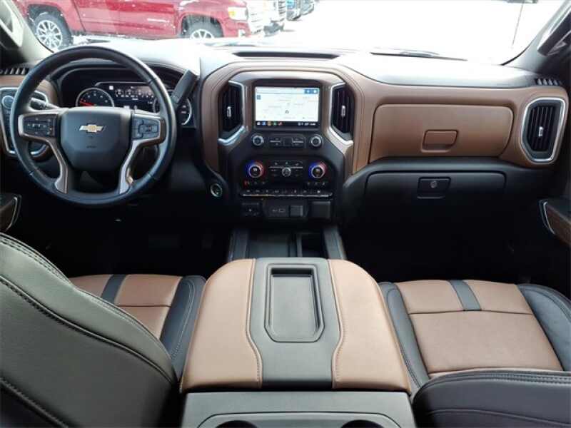 THE 2021 CHEVROLET SILVERADO HIGH COUNTRY CREW CAB 4WD OFFERS PREMIUM COMFORT WITH VENTILATED FRONT LEATHER BUCKET SEATS, HEATED FRONT AND REAR SEATS, DRIVER MEMORY SETTINGS, AND A HEATED LEATHER-WRAPPED STEERING WHEEL. IT FEATURES ADVANCED TECHNOLOGY INCLUDING BOSE PREMIUM AUDIO, NAVIGATION, WIRELESS CHARGING, HEAD-UP DISPLAY, HD SURROUND VISION WITH TRAILER CAMERAS, AND A POWER SUNROOF THROUGH THE HIGH COUNTRY DELUXE PACKAGE. EXTERIOR UPGRADES INCLUDE 22 POLISHED ALUMINUM WHEELS, POWER UP/DOWN TAILGATE, SPRAY-ON BEDLINER, LED LIGHTING, AND DUAL EXHAUST WITH POLISHED TIPS, ALL POWERED BY THE 6.2L ECOTEC3 V8 WITH ADAPTIVE RIDE CONTROL.