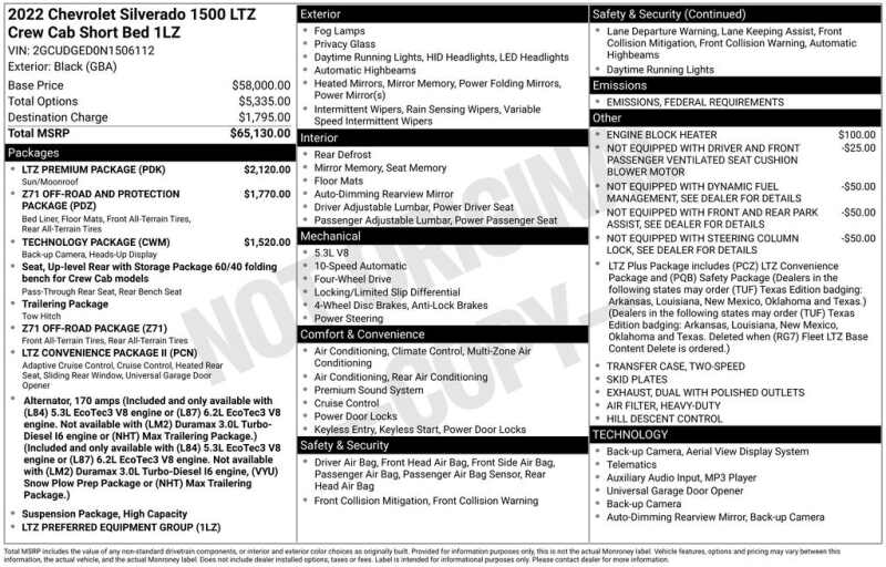 This Chevrolet Silverado 1500 is well equipped and includes the following features and benefits, Heated Seats, Touchscreen Controls, Apple CarPlay, Android Auto, 4x4 / 4 Wheel Drive / AWD, 15 Diagonal Multicolor Head-Up Display, All-Weather Floor Liner (LPO) (AAK), Bed View Camera, Chevytec Spray-On Black Bedliner, LTZ Convenience Package II, LTZ Premium Package, Power Sunroof, Rear Camera Mirror, Technology Package, Z71 Off-Road & Protection Package, Z71 Off-Road Package. Odometer is 37710 miles below market average!