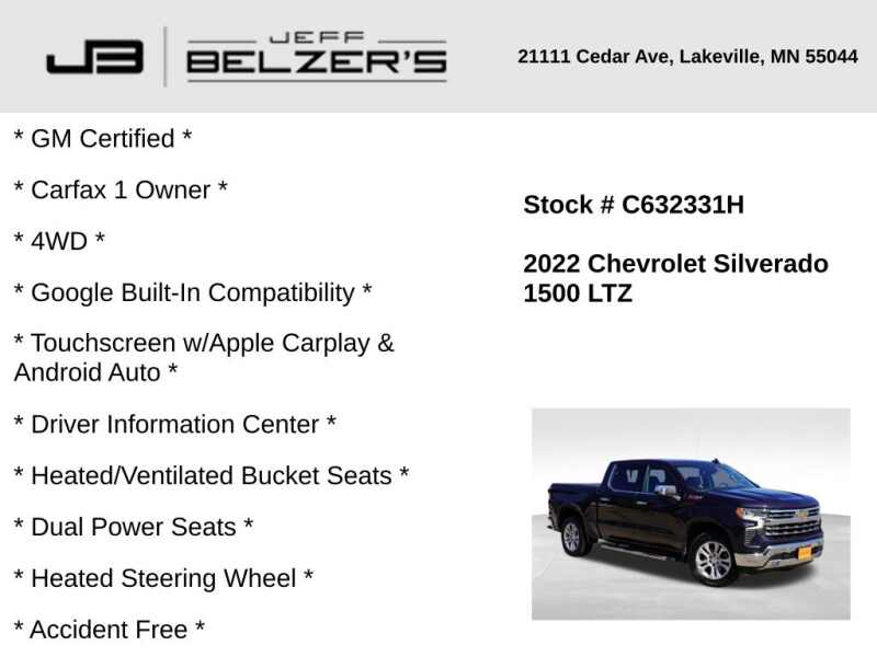 * GM Certified * Carfax 1 Owner * 4WD * Google Built-In Compatibility * 13.4-Inch Touchscreen w/Apple Carplay & Android Auto * 12.3-Inch Driver Information Center * Heated/Ventilated Bucket Seats * Dual Power Seats * Heated Steering Wheel * Accident Free * Side Blind Zone Alert * Rear Cross Traffic Alert * Lane Departure Warning * Autonomous Emergency Braking * Forward Collision Alert * Lane Keep Assist * Bluetooth Hands Free * Cruise Control * Adaptive Cruise Control * Remote Start * 20 Inch Alloy Wheels * Bose Premium Sound * LED Tail Lamps * LED Fog Lamps * LED Headlamps * Auto High Beams * Rain Sensing Wipers * Power Folding Outside Mirrors * Keyless Open/Keyless Start * Power Tailgate * Power Sliding Rear Window * Universal Garage Door Opener * Front & Rear Park Assist * Dual-Zone Automatic Climate Control * Rear Camera * Trailering Package * Integrated Trailer Brake Controller * Spray-On Bedliner * Z71 Off-Road Suspension * Locking Rear Differential * 2-Speed Transfer Case * Dual Exhaust * Satellite Radio *