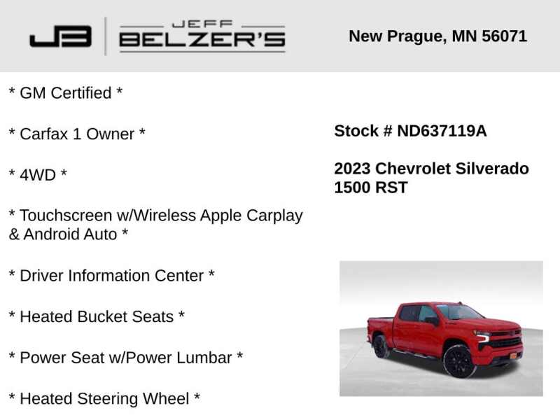 * GM Certified * Carfax 1 Owner * 4WD * 13.4-Inch Touchscreen w/Wireless Apple Carplay & Android Auto * 12.3-Inch Driver Information Center * Heated Bucket Seats * Power Seat w/Power Lumbar * Heated Steering Wheel * Lane Departure Warning * Lane Keep Assist * Autonomous Emergency Braking * Forward Collision Alert * Bluetooth Hands Free * Cruise Control * Remote Start * 22 Inch Alloy Wheels * LED Tail Lamps * LED Fog Lamps * LED Headlamps * Auto High Beams * Keyless Open/Keyless Start * Power Sliding Rear Window * Dual-Zone Automatic Climate Control * Rear Camera * Trailering Package * Integrated Trailer Brake Controller * Spray-On Bedliner * LED Box Lighting * Satellite Radio *
