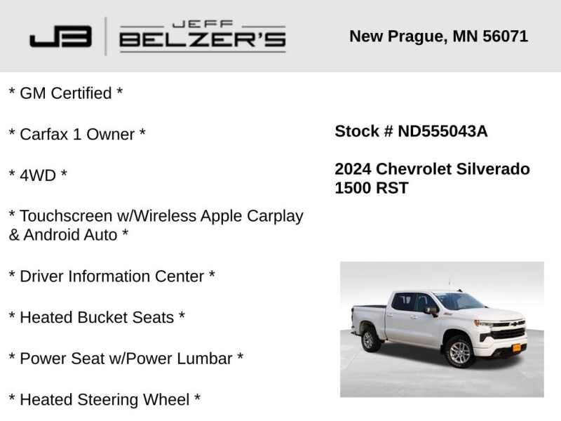 * GM Certified * Carfax 1 Owner * 4WD * 13.4-Inch Touchscreen w/Wireless Apple Carplay & Android Auto * 12.3-Inch Driver Information Center * Heated Bucket Seats * Power Seat w/Power Lumbar * Heated Steering Wheel * Accident Free * Side Blind Zone Alert * Rear Cross Traffic Alert * Lane Departure Warning * Lane Keep Assist * Autonomous Emergency Braking * Forward Collision Alert * Bluetooth Hands Free * Cruise Control * Remote Start * 18 Inch Alloy Wheels * Bose Premium Sound * LED Tail Lamps * LED Fog Lamps * LED Headlamps * Auto High Beams * Keyless Open/Keyless Start * Universal Garage Door Opener * Power Sliding Rear Window * Dual-Zone Automatic Climate Control * Rear Camera * Surround View Camera * Trailering Package * Integrated Trailer Brake Controller * Z-71 Off-Road Suspension * LED Box Lighting * Locking Rear Differential * 2-Speed Transfer Case * Satellite Radio *