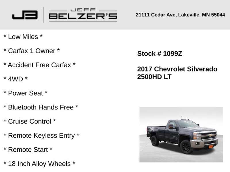 * Low Miles (the lowest mileage standard cab LT 4WD available in the nation) * Carfax 1 Owner * Accident Free Carfax * Alaskan Snow Plow Special Edition Includes Black Power-Adjustable Heated Outside Mirrors, Auto-Dimming Inside Rear-View Mirror, Smoked Amber Roof Marker Lamps, Snow Plow Prep Package, 220 Amps Alternator, Provision for Cab Roof-Mounted Lamp/Beacon, Spray-On Pickup Box Bed Liner w/Bowtie Logo, Wheels 18in Black Aluminum * 4WD * Power Seat * Bluetooth Hands Free * Cruise Control * Remote Keyless Entry * Remote Start * 18 Inch Alloy Wheels * Trailering Package * Integrated Trailer Brake Controller * Z71 Off-Road Suspension * LED Box Lighting * Locking Rear Differential * 2-Speed Transfer Case * Satellite Radio *