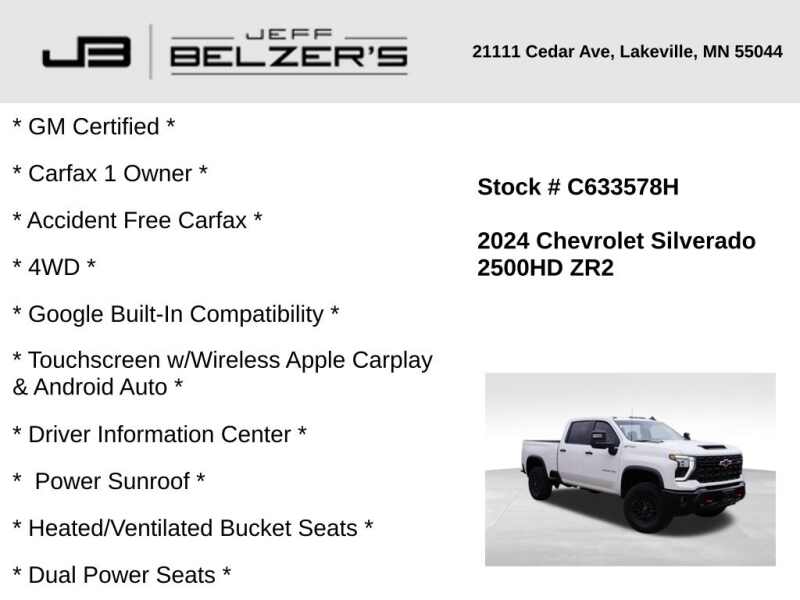* GM Certified * Carfax 1 Owner * Accident Free Carfax * 4WD * Google Built-In Compatibility * 13.4-Inch Touchscreen w/Wireless Apple Carplay & Android Auto * 12.3-Inch Driver Information Center * Power Sunroof * Heated/Ventilated Bucket Seats * Dual Power Seats * Heated Steering Wheel * Heated Rear Outboard Seats * Lane Departure Warning * Autonomous Emergency Braking * Forward Collision Alert * Bluetooth Hands Free * Cruise Control * Remote Start * Bose Premium Sound * LED Tail Lamps * LED Fog Lamps * LED Headlamps * Trailer Tow Mirrors * Keyless Open/Keyless Start * Power Sliding Rear Window * Dual-Zone Automatic Climate Control * Rear Camera * Trailering Package * Integrated Trailer Brake Controller * 5th Wheel/Gooseneck Prep * Heavy-Duty Snow Plow Prep Package * Spray-On Bedliner * Satellite Radio *