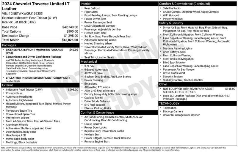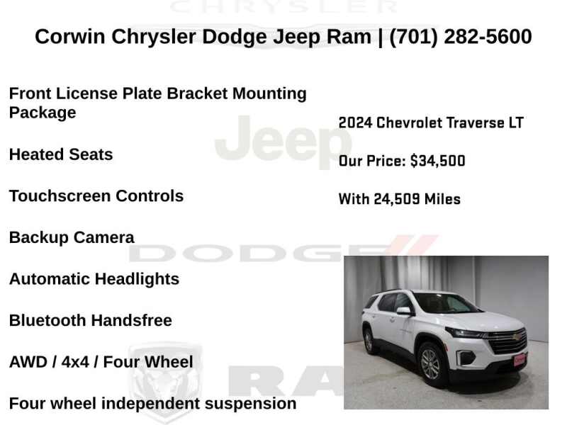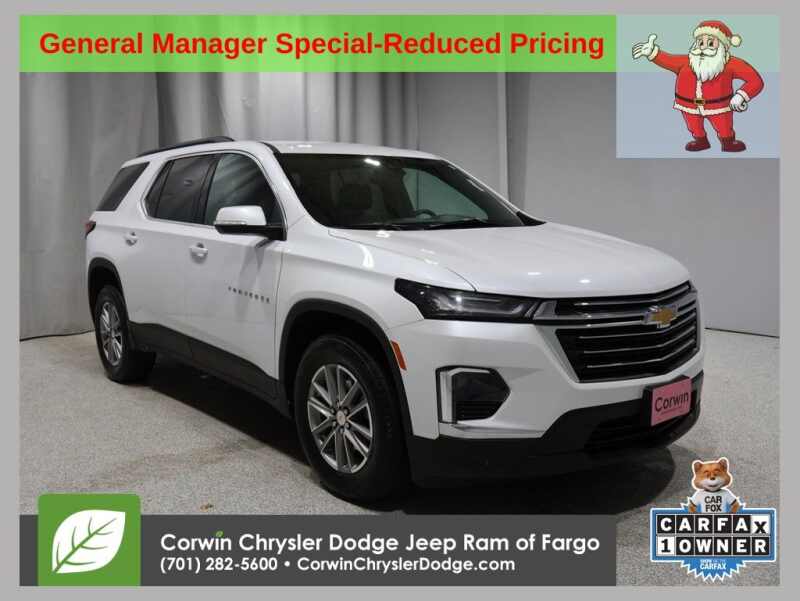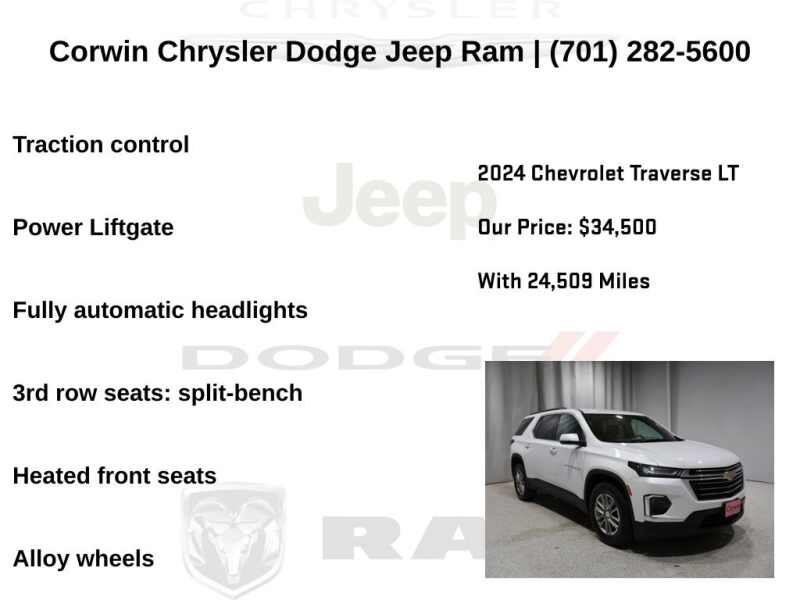 WELCOME TO DECEMBER AT CORWIN CHRYSLER DODGE JEEP RAM OF FARGO!! WE HAVE GREAT SAVINGS ON ALL OF OUR PRE-OWNED VEHICLES AVAILABLE!! WE HAVE ONE OF THE LARGEST SELECTION OF INVENTORIES IN OUR AREA AT ONE SINGLE LOCATION!! Priced below KBB Fair Purchase Price! Iridescent Pearl Tricoat 2024 Chevrolet Traverse Limited LT Leather 4D Sport Utility AWD 3.6L V6 SIDI VVT CARFAX One-Owner. Clean CARFAX.
