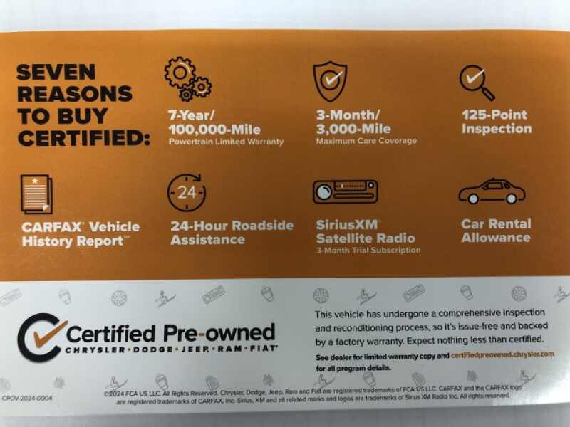 CERTIFIED PRE-OWNED!!! The vehicle underwent a 125-Point Inspection/Reconditioning process and comes with a 7-Year/100K mile factory powertrain warranty, along with a 3-month/3K mile factory Maximum Care Warranty! (If the vehicle is still under the original factory 3-year/36K mile warranty, that would run concurrent with the 3-mo/3K mile warranty). Also included at no extra cost is 24 Hour Roadside Assistance, Car Rental Allowance, and a 3-month SiriusXM Satellite Radio trial.