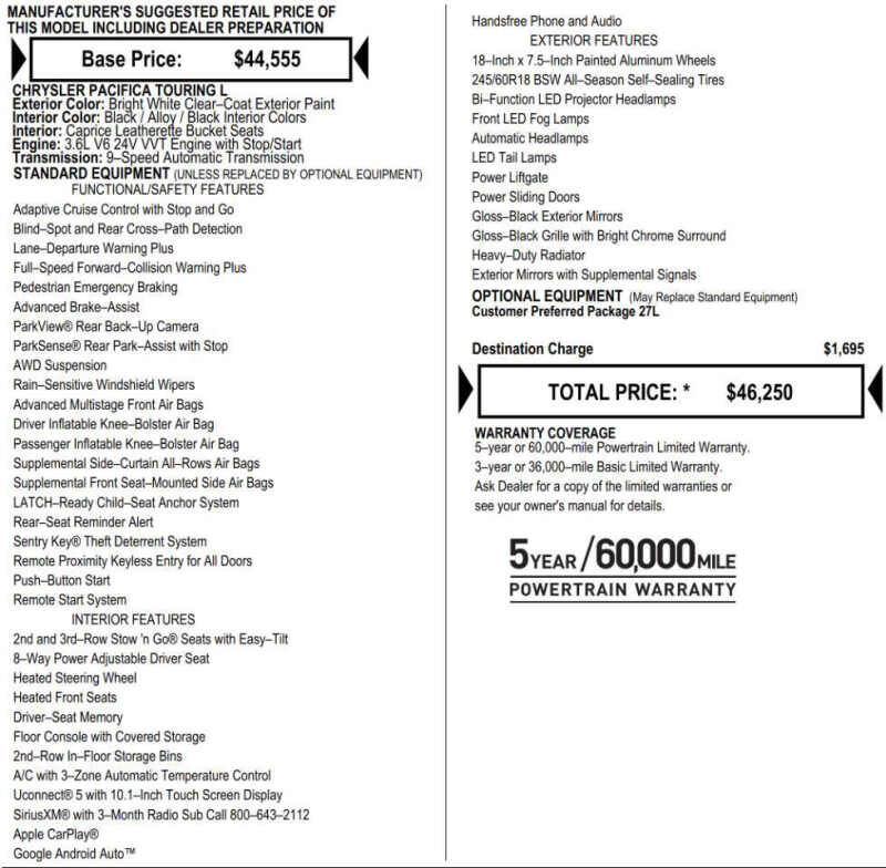 The 2024 Chrysler Pacifica Touring L AWD 4dr Mini Van is priced at $26,990. It is equipped with a 3.6L V6 engine and an automatic transmission. The car has 55K miles on it and is in excellent condition both inside and outside. Came from Texas-no rust! It comes with various features and options. If you're interested in this Chrysler Pacifica or want more information, you can contact the sales team at Ace Auto Cars by calling or texting (952) 208-0584. You can also visit their website, www.AceAutoCars.com, to view more cars and access a 360 walk-around and panoramic interior view of the Chrysler Pacifica by copying and pasting the provided link https//spins.impel.io/aceautocars/2c4rc3bg8rr185721 This vehicle has a prior salvage title due to hail damage. It has sustained minor hail damage. Hood was replaced. We're happy to provide pictures of the vehicle before the repairs upon request. WARRANTY Additionally, the car comes with a warranty of 30 days or 1,000 miles, whichever comes first, providing you with some confidence in your purchase even after leaving the lot. Vehicles are sold on a first-come, first-served basis. To secure a vehicle, a non-refundable 10% deposit is necessary.