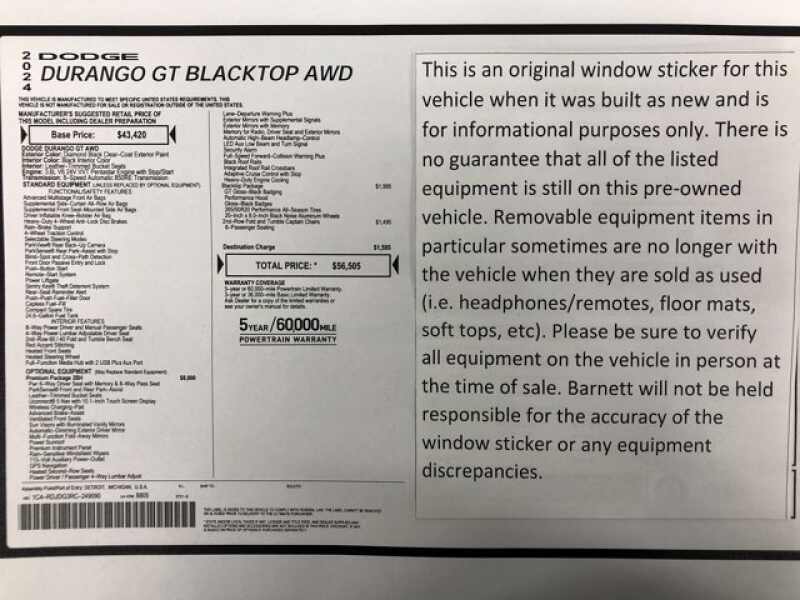 - QUICK ORDER PACKAGE 2BH GT PREMIUM -inc Engine 3.6L V6 24V VVT UPG I w/ESS Transmission 8-Speed Automatic (850RE) 7 & 4 Pin Wiring Harness For Details Visit DriveUconnect.com Integrated Roof Rail Crossbars Power Driver/Passenger 4-Way Lumbar Adjust Bright Front Door Sill Scuff Pads 1-Year Trial (Registration Required) 506 Watt Amplifier Dual Remote USB Port - Charge Only Class IV Receiver Hitch Security Alarm Floor Console w/Leather Armrest Power 6x9 Multi-Function Foldaway Mirrors Power Tilt & Telescopic Steering Column 9 Alpine Amplified Speakers w/Subwoofer Advanced Brake Assist Disassociated Touchscreen Display Wireless Charging Pad Power 8-Way Driver Memory 8-Way Passenger Seats Ventilated Front Seats SiriusXM Guardian - Included Trial (B) Full Speed Forward Collision Warning Plus 115V Auxiliary Power Outlet Adaptive Cruise Control w/Stop Sun Visors w/Illuminated Vanity Mirrors Rear Load Leveling Suspension Rain Sensitive Windshield Wipers ParkSense