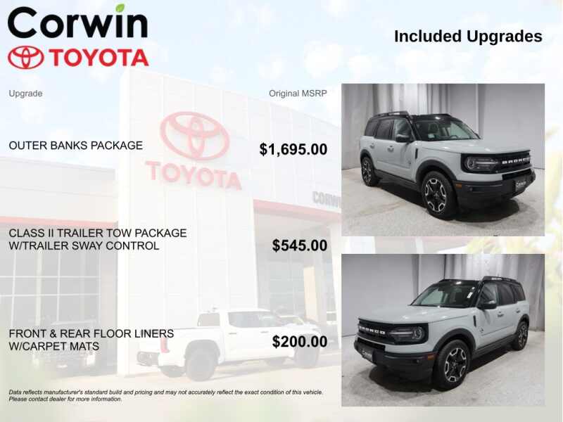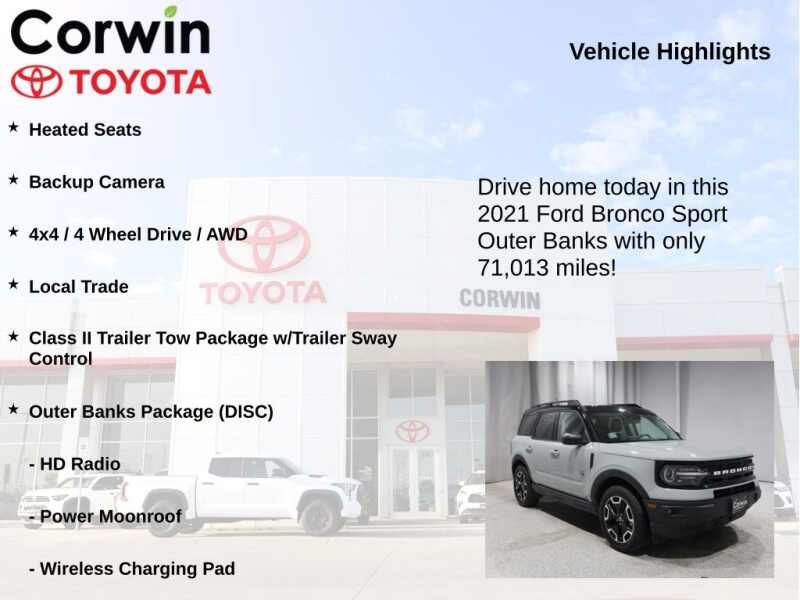 This Ford Bronco Sport is well equipped and includes the following features and benefits, Heated Seats, Backup Camera, 4x4 / 4 Wheel Drive / AWD, Local Trade, Class II Trailer Tow Package w/Trailer Sway Control, Driver door bin, HD Radio, Outer Banks Package (DISC), Power Moonroof, Wireless Charging Pad. 25/28 City/Highway MPG