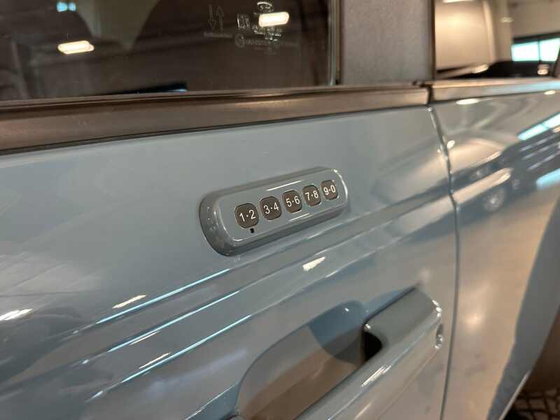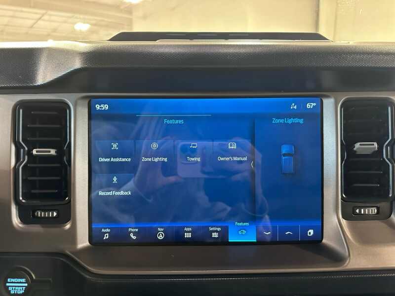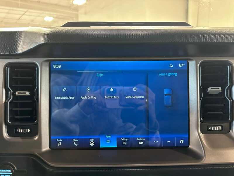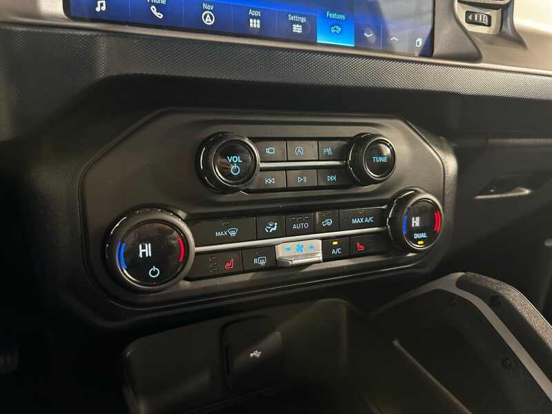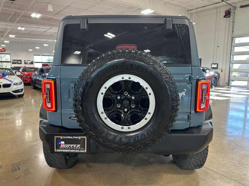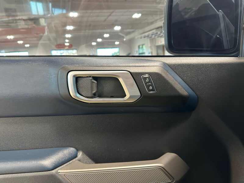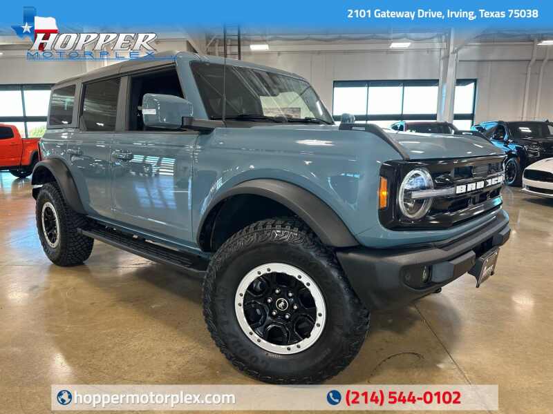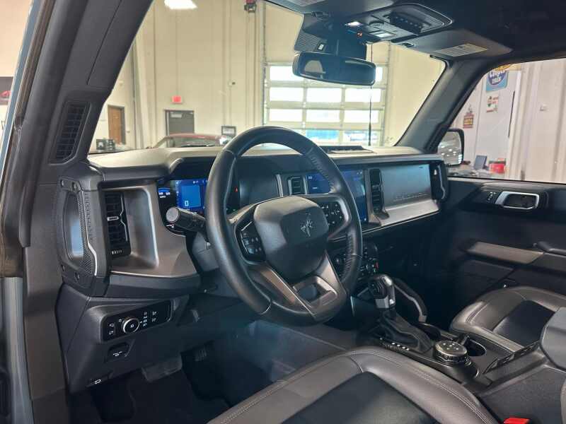 2023 Ford Bronco Outer Banks 2.7L Ecoboost V6, Sasquatch Package, 12 LCD Center stack Touchscreen w/Navigation, 360-Degree Camera, Hard-Top Color Molded w/Sound Deadening Headliner, Premium 2 Tone Leather Seating, Area 51 Blue Exterior / Gray/Navy Two Tone Leather,4D Sport Utility 4WD 10-Speed Automatic 2.7L EcoBoost V6 12 LCD Capacitive Touchscreen w/Swipe Capability, 360-Degree Camera, 4-Wheel Disc Brakes, 4.7 Final Drive Ratio, 7 Speakers, ABS brakes, Additional Sound Deadening, AM/FM radio SiriusXM with 360L, AM/FM Stereo, Auto High-beam Headlights, Brake assist, Compass, Delay-off headlights, Driver door bin, Driver vanity mirror, Dual front impact airbags, Dual front side impact airbags, Electronic Stability Control, Emergency communication system 911 Assist, Equipment Group 313A High Package, Exterior Parking Camera Rear, Front anti-roll bar, Front Bucket Seats, Front Center Armrest, Front Parking Sensors, Front reading lights, Front wheel independent suspension, Fully automatic headlights, Heated door mirrors, High Clearance Fender Flares, High Clearance Suspension, Illuminated entry, Information on Demand Panel, Integrated roll-over protection, Occupant sensing airbag, Outside temperature display, Overhead airbag, Overhead console, Panic alarm, Passenger door bin, Passenger vanity mirror, Position-Sensitive Bilstein Shock Absorbers, Power door mirrors, Power steering, Power windows, Radio data system, Remote keyless entry, Sasquatch Package, Security system, Sideview Mirrors, SiriusXM Radio w/360L, Speed control, Split folding rear seat, Steering wheel mounted audio controls, SYNC 4, Tachometer, Telescoping steering wheel, Tilt steering wheel, Traction control, Trip computer, Variably intermittent wipers, Wheels 17 Black High Gloss-Painted Aluminum.