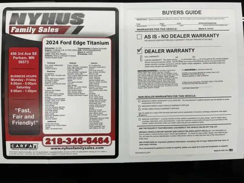The 2024 Ford Edge Titanium is a striking used SUV that combines style, versatility, and advanced technology to elevate your driving experience. Finished in a captivating Blue Metallic exterior with a sleek black interior, this AWD vehicle offers a perfect blend of elegance and functionality. With 52,148 miles on the odometer, its 2.0-liter turbocharged four-cylinder engine delivers a robust 250 horsepower and 275 lb-ft of torque, ensuring confident acceleration and smooth highway cruising. The sophisticated 8-speed automatic transmission and fuel economy of 21 mpg city and 28 mpg highway make it an ideal choice for daily commuting and weekend adventures. Inside, premium features such as heated seats, memory seating, and a hands-free liftgate provide added convenience, while modern connectivity options like Apple CarPlay, Bluetooth, satellite radio, and a Wi-Fi hotspot keep you seamlessly connected on the go. This Ford Edge Titanium is equipped with a comprehensive suite of safety and security features designed to protect you and your passengers. Dual front knee airbags, rear parking sensors, and a rearview camera system washer enhance visibility and safety during your drives. The vehicle also includes anti-lock braking system (ABS), electronic parking brake with auto-off, cornering brake control, and emergency braking preparation to ensure optimal braking performance. Power door locks with auto-locking, a programmable safety key, and anti-lockout locks give you peace of mind, while advanced safety systems work together to provide a secure driving environment at all times. 2024 Ford Edge Safety and Security Features The safety and security of this vehicle are reinforced with dual front knee airbags and rear parking sensors that assist in avoiding obstacles and protecting occupants. The ABS system and cornering brake control optimize braking efficiency, especially during emergency stops or sharp turns. An emergency braking preparation system is included to enhance safety in sudden stop scenarios. Power door locks with anti-lockout and auto-locking functions, along with a programmable safety key, add convenience and security. The rear camera system washer ensures clear visibility when reversing, while the electronic parking brake with auto-off feature simplifies parking maneuvers and prevents accidental rolling. 2024 Ford Edge Entertainment and Technology Features The 2024 Ford Edge Titanium boasts a premium 12-inch infotainment touchscreen that serves as the central hub for its advanced technology features. With 780 watts of power and 11 surround sound speakers, the audio system delivers an immersive listening experience. Compatibility with FordPass Connect allows for smart device app integration, including engine start and remote vehicle control. Hands-free phone call operation, voice-activated HD radio, and a touch screen display ensure intuitive access to entertainment and connectivity options. The vehicle also supports satellite radio, Wi-Fi hotspot, and smart device app functions, making it a perfect blend of entertainment and convenience for modern drivers. 2024 Ford Edge Performance Features Under the hood, the 2024 Ford Edge Titanium features an efficient auto start/stop system that helps conserve fuel during idle periods, contributing to its impressive fuel economy. The vehicles on-demand 4WD system provides enhanced traction and stability across diverse road conditions, ensuring confident handling whether on city streets or rougher terrain. These performance features, combined with its powerful turbocharged engine, make the Edge Titanium a dynamic and reliable SUV that adapts seamlessly to your driving needs. Carfax One Owner, Accident Free Carfax History Report, AWD / All Wheel Drive, AWD, ActiveX-Trimmed Heated Sport Bucket Seats, Auto High-beam Headlights, Automatic temperature control, Front dual zone A/C, Fully automatic headlights, Heated door mirrors, Heated front seats, Heated steering wheel, Memory seat, Power driver seat, Power Liftgate, SiriusXM w/360L, SYNC 4A w/Enhanced Voice Recognition, Wheels 19 Luster Nickel-Painted Aluminum. Competitive and flexible used vehicle financing is available for this vehicle. Visit NyhusFamilySales.com for Financing Options. 2024 Ford Edge Titanium Atlas Blue Metallic EcoBoost 2.0L I4 GTDi DOHC Turbocharged VCT Dealer Disclosure Sales Tax, Title/Transfer Fees, Registration Fees, and Dealer Document Administration Fee of $350, are in addition to the advertised price. **Hablamos Espan?ol!** , **1,000+ Google Reviews with a 4.8 Rating**, **Delivery Available to Your Home or Office**, **Up-Front / Haggle Free Internet Pricing**, **Quick & Painless Trade-In Quotes**, **Financing Options For Good or Bad Credit**, **Fast, Fair and Friendly Sales Staff**
