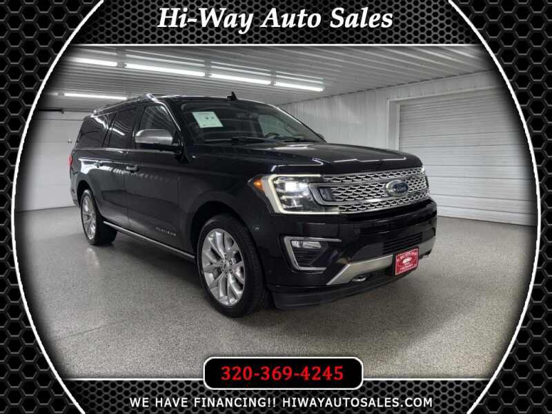 Recent Arrival! Odometer is 41060 miles below market average! 2019 Ford Expedition Max Black Platinum 4WD 10-Speed Automatic MP3, Bluetooth, Clean CarFax, Leather, Heated Seats, Heated and Cooled Seats, Sunroof/Moonroof, Navigation/GPS/NAVI, DVD/Rear Entertainment/RES, 2nd Row Captain Chairs/Buckets, Power Lift Gate, Backup Camera, Remote Start, Cruise Control, Steering Wheel Controls, Keyless Entry, USB/AUX ports, MP3 player. Please call/text 320-369-4245 or visit our store 319 4th Avenue South. Pease, MN. Stop by for a test drive, and check out some of our financing options! Available only at Hi-Way Auto Sales, where the customer is #1. Family owned and operated since 1953! Please call/text 320-369-4245 or visit our store 319 4th Avenue South. Pease MN. Stop by for a test drive and check out some of our financing options! Available only at Hi-Way Auto Sales where the customer is #1. Family owned and operated since 1953!Visit Hi-Way Auto Sales online at www.hiwayautosales.com to see more pictures of this vehicle or call us at 320-369-4245 today to schedule your test drive.