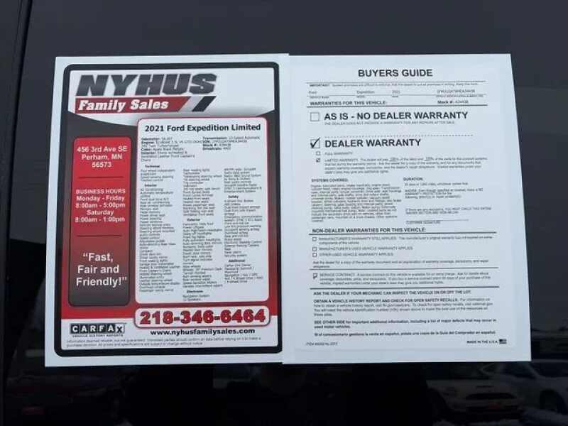 Discover the 2021 Ford Expedition Limited, a formidable SUV blending luxury, versatility, and advanced technology. With just over 58,000 miles, this Agate Black Metallic beauty commands attention on the road while offering a spacious interior with Ebony leather seats, perfect for family adventures or daily commutes. Powered by a robust 3.5-liter twin-turbo V6 engine generating 375 horsepower and 470 lb-ft of torque, it delivers confident performance paired with a smooth 10-speed automatic transmission and a capable 4WD system. This used Expedition comes loaded with premium features, including adaptive cruise control, Apple CarPlay, a backup camera, blind spot monitoring, Bluetooth, collision warning, cross traffic alert, fog lights, and a hands-free liftgate, ensuring safety and convenience. The interior boasts heated and rear heated seats, memory settings, navigation, a sunroof, third-row seating, rear A/C, and wireless charging, making every journey comfortable and connected. This SUV is equipped with a comprehensive suite of safety and security features designed to protect every occupant. Front and rear parking sensors, alongside 4-wheel ABS, provide confidence during parking maneuvers. The interior motion sensor anti-theft system and anti-tow sensors add peace of mind, while power door locks offer anti-lockout and auto-locking functions for added convenience. Rear camera washer, a programmable safety key, and hill descent control enhance safety in various driving conditions, especially off-road. The Expedition's safety package ensures that both driver and passengers are well protected in all situations, making it an ideal choice for those seeking reliability and security. 2021 Ford Expedition Safety and Security Features This model offers front and rear parking sensors, enhancing maneuverability in tight spaces. Four-wheel ABS ensures stability during emergency stops. An interior motion sensor anti-theft system and anti-tow sensors provide robust security against theft. Power door locks feature anti-lockout and automatic locking functions to prevent accidental lockouts and ensure safety. The rear camera washer maintains visibility, while the programmable safety key allows for personalized security settings. Hill descent assist adds confidence during off-road adventures, making this SUV suitable for diverse terrains and driving conditions. 2021 Ford Expedition Entertainment and Technology Features The Expedition Limited is designed to keep everyone entertained with an impressive 1100-watt sound system and a total of 11 speakers, delivering immersive audio quality. FordPass Connect enables smart device app compatibility for remote engine start, vehicle tracking, and other remote functions. An 8-inch infotainment touchscreen with HD radio and a touch screen display provides intuitive control over entertainment and navigation. Hands-free phone call integration and voice-operated radio ensure seamless connectivity on the go. A powerful subwoofer enhances bass, making every listening experience dynamic and engaging. 2021 Ford Expedition Performance Features Efficiency and capability are at the core of the Expeditions performance. Auto start/stop technology helps conserve fuel during idling, while the electronic hi-lo 4WD selector allows drivers to choose the optimal drivetrain setting for varying conditions. The part-time 4WD system with on-demand capability provides excellent traction and control, whether navigating city streets or tackling off-road terrain. These features combine to offer a balanced driving experience, ensuring the Expedition delivers both power and efficiency whenever needed. Carfax One Owner, Panoramic Sunroof / Moonroof, Navigation / Nav / GPS, 4x4 / 4 Wheel Drive / 4WD / 4-Wheel Drive, 4WD, 3rd row seats split-bench, Adjustable pedals, Auto High-beam Headlights, Exterior Parking Camera Rear, Front dual zone A/C, Heated & Ventilated Leather Front Captain's Chairs, Heated front seats, Heated rear seats, Heated steering wheel, Memory seat, Power Liftgate, SiriusXM Satellite Radio, SYNC 3 Communications & Entertainment System, Ventilated front seats, Wheels 20 Premium Dark Tarnish-Painted. Competitive and flexible used vehicle financing is available for this vehicle. Visit NyhusFamilySales.com for Financing Options. 2021 Ford Expedition Limited Agate Black Metallic EcoBoost 3.5L V6 GTDi DOHC 24V Twin Turbocharged Dealer Disclosure Sales Tax, Title/Transfer Fees, Registration Fees, and Dealer Document Administration Fee of $350, are in addition to the advertised price. **Hablamos Espan?ol!** , **1,000+ Google Reviews with a 4.8 Rating**, **Delivery Available to Your Home or Office**, **Up-Front / Haggle Free Internet Pricing**, **Quick & Painless Trade-In Quotes**, **Financing Options For Good or Bad Credit**, **Fast, Fair and Friendly Sales Staff**