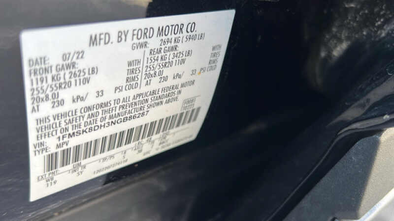 - VIN 1FMSK8DH3NGB86287