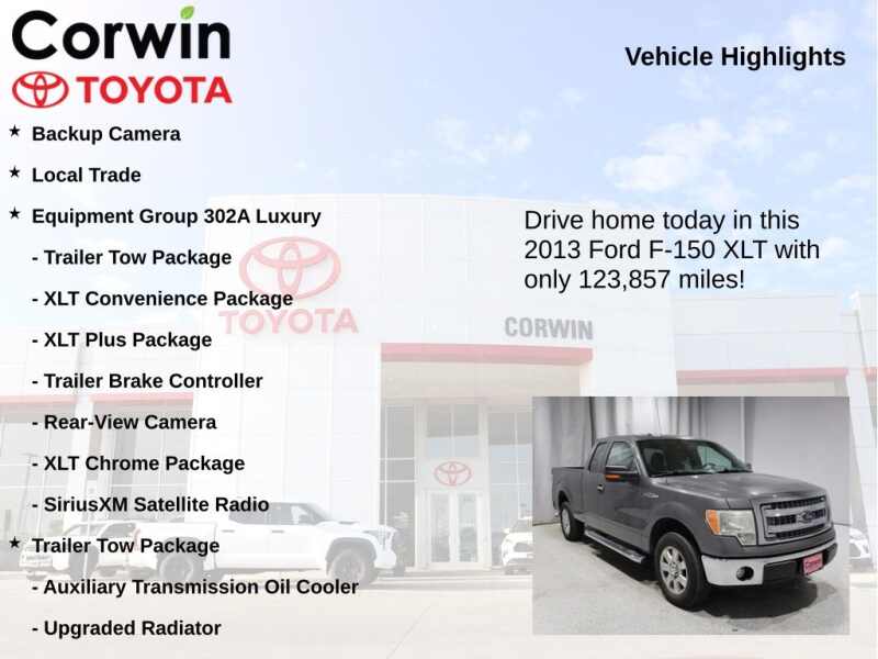 This Ford F-150 is well equipped and includes the following features and benefits, Backup Camera, Local Trade, Equipment Group 302A Luxury, Rear-View Camera, SiriusXM Satellite Radio, Trailer Brake Controller, Trailer Tow Package, XLT Chrome Package, XLT Convenience Package, XLT Plus Package. Odometer is 14294 miles below market average!