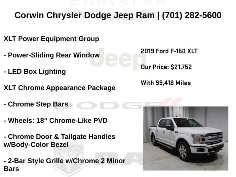 WELCOME TO DECEMBER AT CORWIN CHRYSLER DODGE JEEP RAM OF FARGO!! WE HAVE GREAT SAVINGS ON ALL OF OUR PRE-OWNED VEHICLES AVAILABLE!! WE HAVE ONE OF THE LARGEST SELECTION OF INVENTORIES IN OUR AREA AT ONE SINGLE LOCATION!! Priced below KBB Fair Purchase Price! Oxford White 2019 Ford F-150 XLT 4D SuperCrew 4WD 5.0L V8
