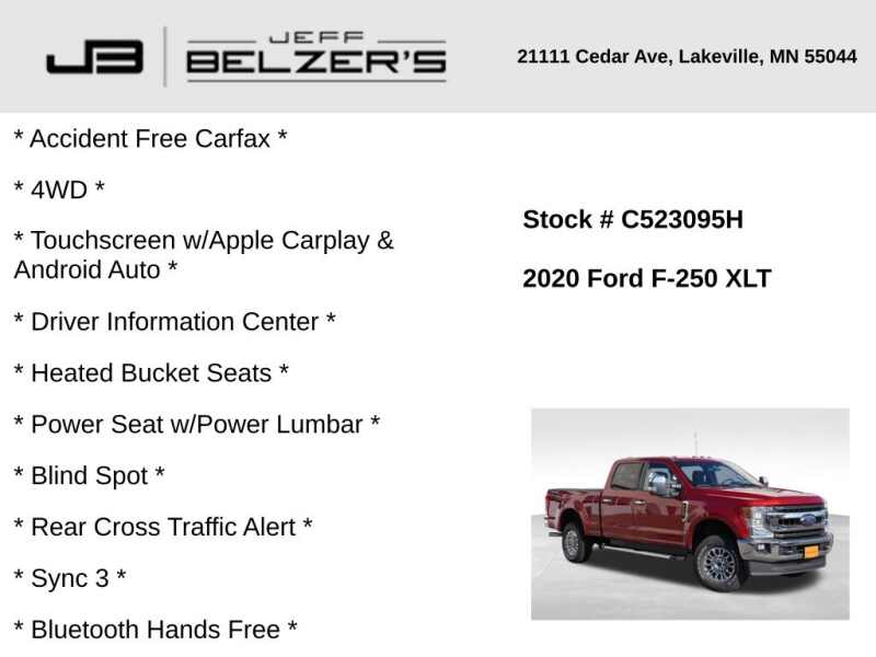 * Accident Free Carfax * 4WD * 8-Inch Touchscreen w/Apple Carplay & Android Auto * Driver Information Center * Heated Bucket Seats * Power Seat w/Power Lumbar * Blind Spot * Rear Cross Traffic Alert * Sync 3 * Bluetooth Hands Free * Cruise Control * Power Adjustable Pedals * 18 Inch Alloy Wheels * Chrome Appearance Package * Auto High Beams * Trailer Tow Mirrors * Power Sliding Rear Window * Reverse Sensing * Dual-Zone Automatic Climate Control * Rear Camera * Trailer Tow * Integrated Trailer Brake Controller * 5th Wheel/Gooseneck Prep * Roof Marker Lamps * FX4 Off-Road Package * LED Box Lighting * Locking Rear Differential * Satellite Radio *