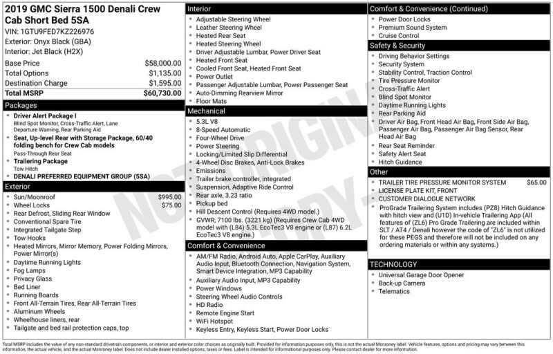 This GMC Sierra 1500 is well equipped and includes these key features and benefits, Heated and Cooled Seats, Navigation System, Touchscreen Controls, Backup Camera, Automatic Headlights, Bluetooth Handsfree, AWD / 4x4 / Four Wheel, 12-Volt Rear Auxiliary Power Outlet, 120-Volt Instrument Panel Power Outlet, 170 Amp Alternator, 2 USB Ports, 2 USB Ports (1st Row), Auxiliary External Transmission Oil Cooler, Chrome Assist Steps, Chrome Recovery Hooks, Color-Keyed Carpeting Floor Covering, Compass, Deep-Tinted Glass, Driver Alert Package I, Electric Rear-Window Defogger, Electrical Lock Control Steering Column, Floor Mounted Console, GMC 4G LTE, GMC Connected Access, HD Radio, HD Rear Vision Camera, Heated 2nd Row Outboard Seats, Heated Driver & Front Passenger Seating, Heavy-Duty Rear Locking Differential, High-Capacity Air Filter, Hill Descent Control, Hitch Guidance, Hitch Guidance w/Hitch View, In-Vehicle Trailering App, Integrated Trailer Brake Controller, Keyless Open & Start, Lane Change Alert w/Side Blind Zone Alert, LED Cargo Area Lighting, Manual Tilt-Wheel & Telescoping Steering Column, Navigation System, OnStar & GMC Connected Services Capable, Perimeter Lighting, Power Door Locks, Power Front Passenger Windows w/Express Up/Down, Power Front Windows w/Driver Express Up/Down, Power Rear Windows w/Express Down, Power Sliding Rear Window w/Rear Defogger, Preferred Equipment Group 5SA, Rear Cross Traffic Alert, Rear Dual USB Charging-Only Ports, Rear Wheelhouse Liners, Remote Vehicle Starter System, Safety Alert Seat, Signature Denali Grille, Spray-On Pickup Bed Liner w/Denali Logo, Steering Wheel Audio Controls, Theft Deterrent System (Unauthorized Entry), Trailering Package, Ultrasonic Front & Rear Park Assist, Universal Home Remote, Ventilated Driver & Front Passenger Seats, Wireless Charging.