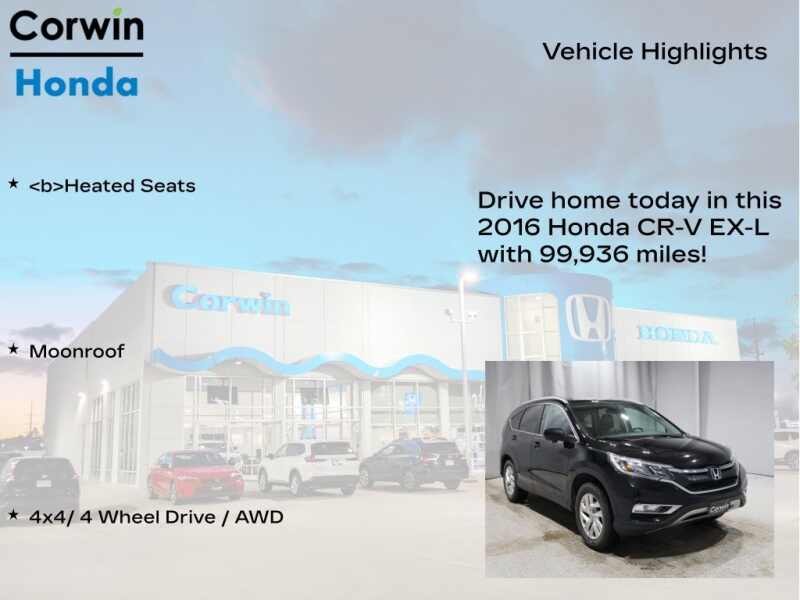 COME ON IN TO CORWIN Honda FOR OUR BLACK FRIDAY PRICING ALL MONTH LONG! TREMENDOUS LINEUP ON OUR OVER 200 PRE-OWNED VEHICLES AT ONE LOCATION!!! Recent Arrival! 2016 Crystal Black Pearl Honda CR-V EX-L AWD Clean CARFAX.