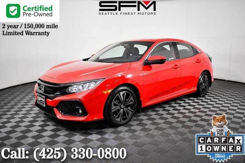 Our athletically inclined One Owner 2018 Honda Civic EX Hatchback in Rallye Red is built for those who love to drive! Powered by a TurboCharged 1.5 Liter 4 Cylinder that delivers 174hp matched to an innovative CVT. Strike the perfect balance of performance, practicality, and efficiency to have a blast in this Front Wheel Drive hatchback while scoring nearly 40mpg on the road. Uniquely expressive and sporty, our EX lets you stand out from the crowd and features great-looking alloy wheels, fog lights, and a power sunroof. Settle inside our comfortable EX cabin that's ready to serve you well with remote engine start, pushbutton start, dual-zone automatic climate control, heated front seats, and illuminated steering wheel-mounted controls. Thanks to the display audio touchscreen, HondaLink smartphone integration, Apple CarPlay/Android Auto, Bluetooth, available satellite radio, and HD radio, you'll stay on track and safely connected. In typical Honda fashion, safety is a priority thanks to the Honda Lane Watch, a multi-angle rearview camera, stability control, ABS, airbags, and other carefully crafted safety features that keep you out of harm's way as you take in this joyride. You deserve sporty styling, versatile practicality, and a brilliant drive, so get behind the wheel of this Civic EX hatch and reward yourself today. Save this Page and Call for Availability. We Know You Will Enjoy Your Seattle Finest Motors Test Drive Towards Ownership! . All prices are exclusive of government fees and taxes, finance charges, dealer documentation fees, and any emission testing charges. A theft recovery device is installed in all our vehicles, and there is an additional cost for this feature. The interior/exterior protection plan is applied to some of our vehicles, and additional fees will apply. The listed price for vehicles does not include additional charges such as license, title, registration fees, state or local taxes, smog fees, credit investigation fees, optional credit insurance, physical damage or liability insurance, or delivery fees. While we try to make sure that all prices posted here are accurate at all times, we cannot be responsible for typographical and other errors, Including those related to the vehicle option list that may appear on the site.We strongly recommend verifying all details indepently. We make every effort to provide you the most accurate, up-to-the-minute information however it is your responsibility to verify with the Dealer that all details listed are accurate. We are not responsible for the accuracy of information reported by third-party platforms like Carfax or Autocheck. Please be aware that advertised prices and available quantities are subject to change without notice. All rates and offers are dependent on bank approval, which can vary based on your credit and the vehicle. . Advertised prices and available quantities are subject to change without notice. All rates and offers are dependent on bank approval, which varies based on applicant's credit as well as the vehicle.
