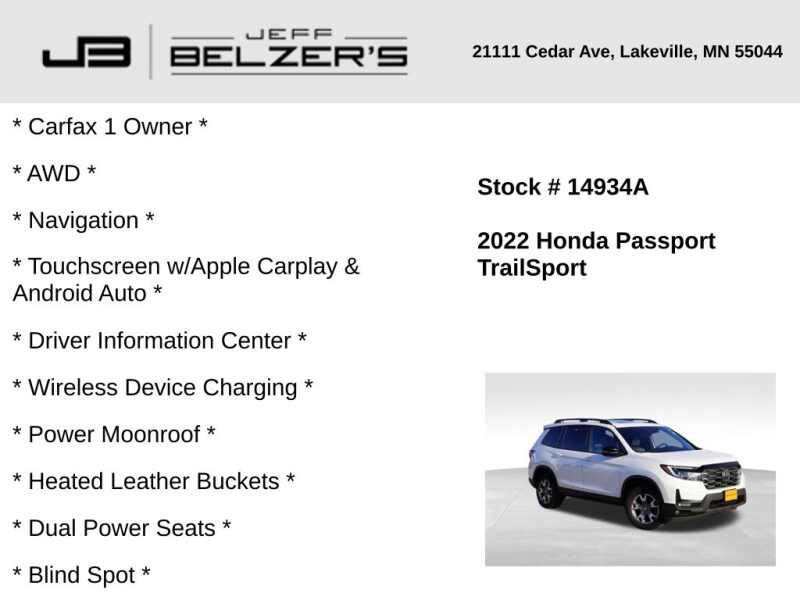 * Carfax 1 Owner * AWD * Navigation Touchscreen w/Apple Carplay & Android Auto * Driver Information Center * Wireless Device Charging * Power Moonroof * Heated Leather Buckets * Dual Power Seats * Blind Spot * Rear Cross Traffic Alert * Lane Departure Warning * Autonomous Emergency Braking * Forward Collision Alert * Lane Keep Assist * Bluetooth Hands Free * Cruise Control * Adaptive Cruise Control * Remote Start * 18 Inch Alloy Wheels * LED Tail Lamps * LED Fog Lamps * Auto High Beams * Push Button Start w/Smart Key * Power Tailgate * Universal Garage Door Opener * Tri-Zone Automatic Climate Control * Rear Camera * Dual Exhaust * Satellite & HD Radio *