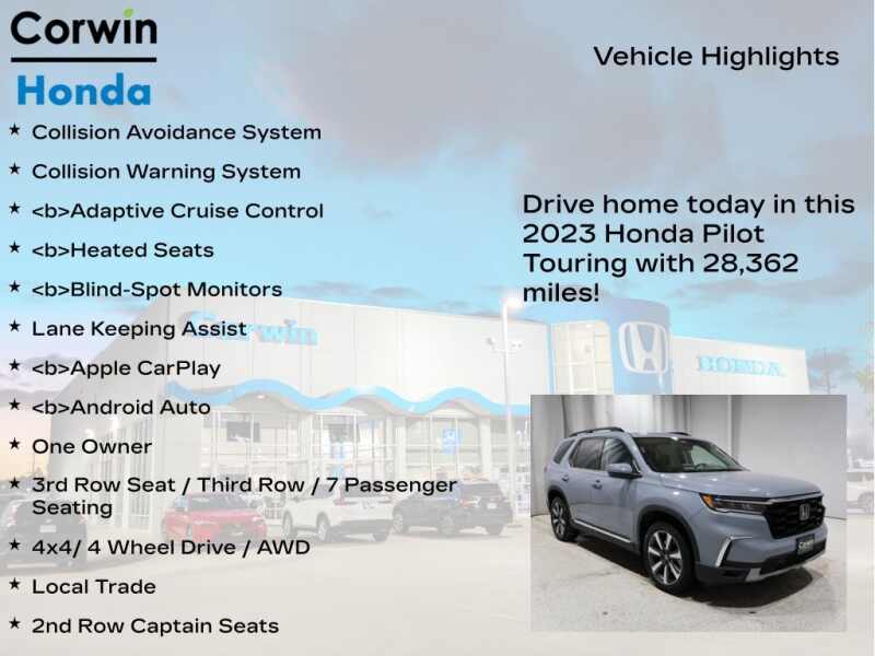 COME ON IN TO CORWIN Honda FOR OUR BLACK FRIDAY PRICING ALL MONTH LONG! TREMENDOUS LINEUP ON OUR OVER 200 PRE-OWNED VEHICLES AT ONE LOCATION!!! Recent Arrival! Priced below KBB Fair Purchase Price! 2023 Sonic Gray Pearl Honda Pilot Touring AWD CARFAX One-Owner. Clean CARFAX.