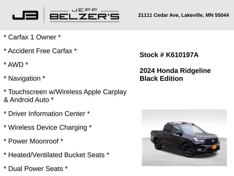 * Carfax 1 Owner * Accident Free Carfax * AWD * 9-Inch Navigation Touchscreen w/Wireless Apple Carplay & Android Auto * 7-Inch Driver Information Center * 540-Watt Premium Audio System with 8 Speakers, including Subwoofer * Wireless Device Charging * Dual-Action Tailgate with In-Bed Trunk * Power Moonroof * Heated/Ventilated Bucket Seats * Dual Power Seats * Heated Steering Wheel * Heated Rear Outboard Seats * Blind Spot * Rear Cross Traffic Alert * Lane Departure Warning * Autonomous Emergency Braking * Forward Collision Alert * Lane Keep Assist * Bluetooth Hands Free * Cruise Control * Adaptive Cruise w/Stop & Go * Remote Start * 18 Inch Alloy Wheels * LED Tail Lamps * LED Fog Lamps * LED Headlamps * Auto High Beams * Power Sliding Rear Window * Power Folding Outside Mirrors * Push Button Start w/Smart Key * Front & Rear Park Assist * Tri-Zone Automatic Climate Control * Rear Camera * Trailer Tow * LED Box Lighting * Dual Exhaust * Satellite & HD Radio *