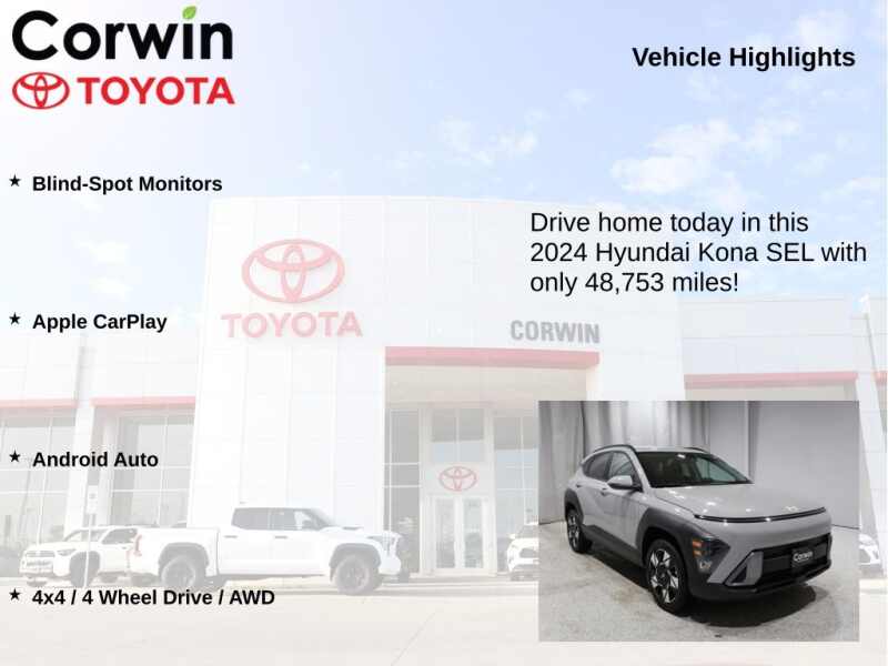 This Hyundai Kona is well equipped and includes the following features and benefits, Blind-Spot Monitors, Apple CarPlay, Android Auto, 4x4 / 4 Wheel Drive / AWD. 27/29 City/Highway MPG