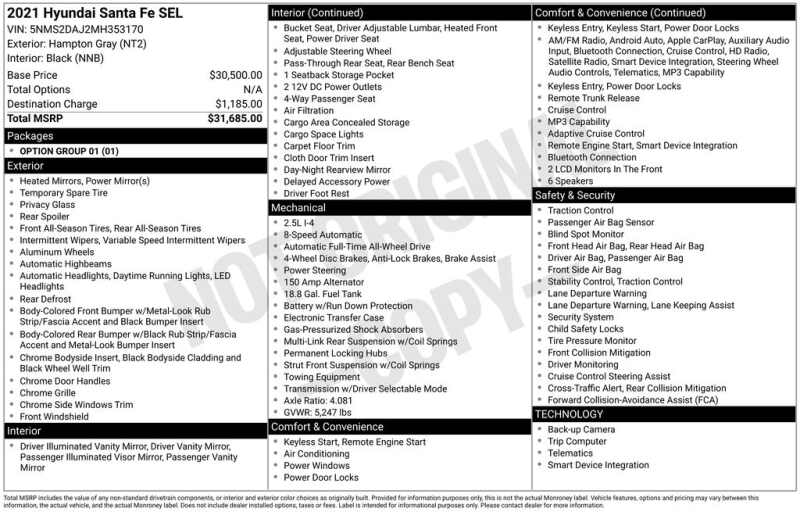 COME ON IN TO CORWIN Honda FOR OUR BLACK FRIDAY PRICING ALL MONTH LONG! TREMENDOUS LINEUP ON OUR OVER 200 PRE-OWNED VEHICLES AT ONE LOCATION!!! Recent Arrival! 2021 Hampton Gray Hyundai Santa Fe SEL AWD CARFAX One-Owner.