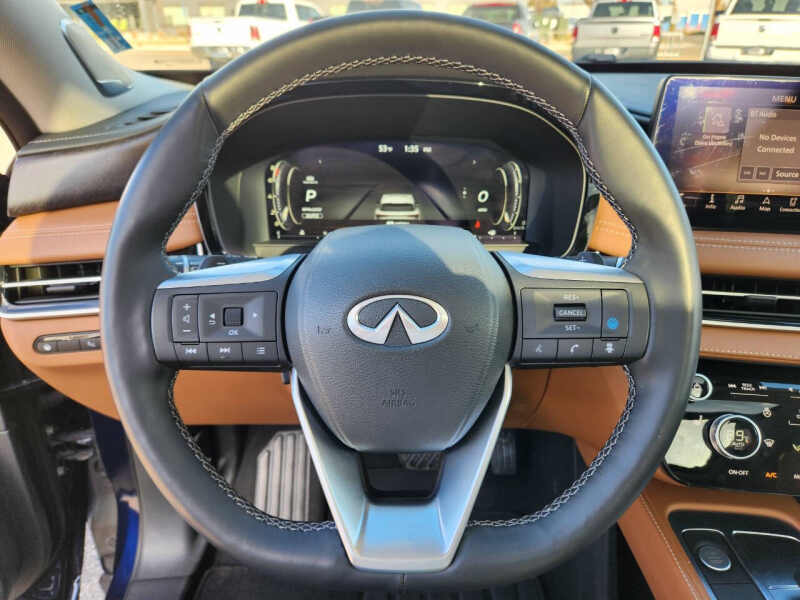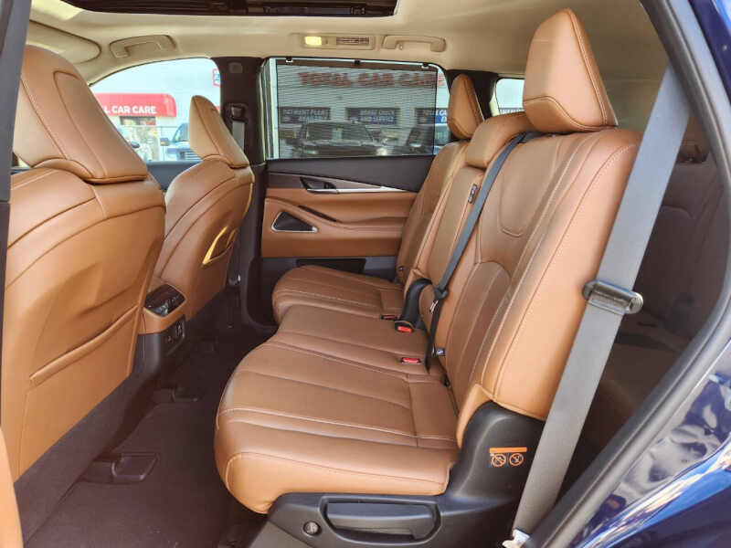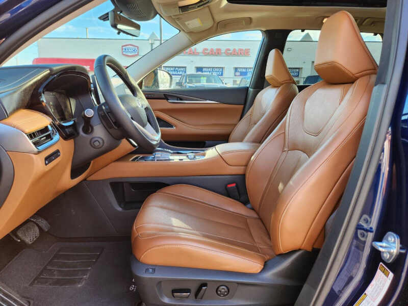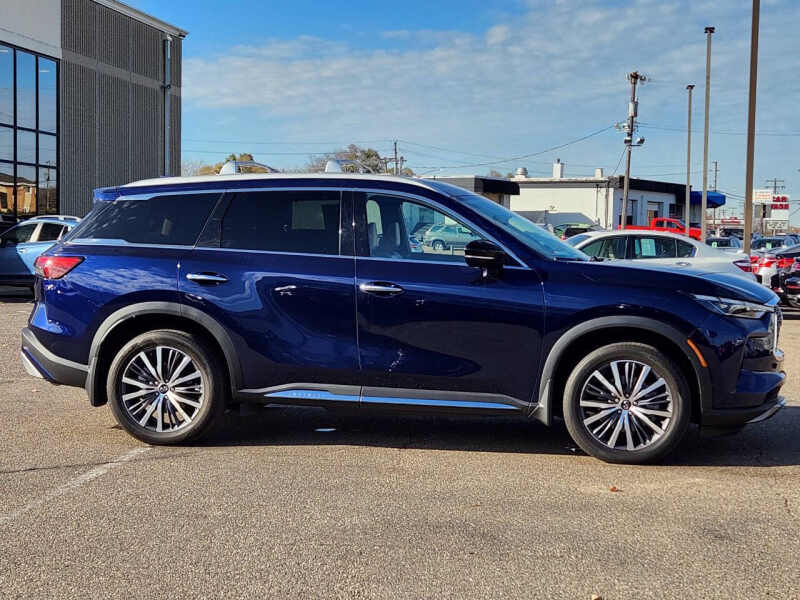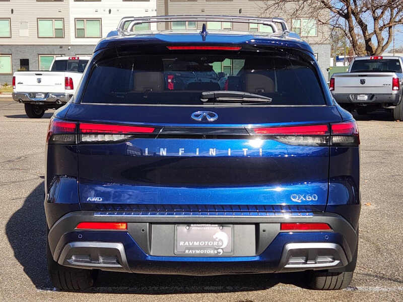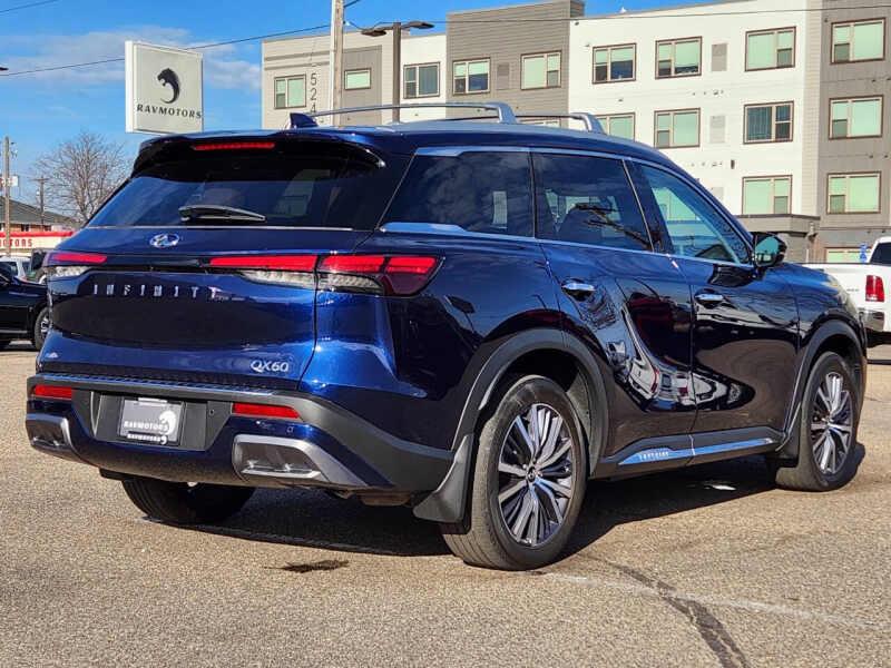 This vehicle is located at our Crystal store. Experience refined luxury and advanced performance with the 2023 INFINITI QX60 Sensory AWD, the perfect blend of sophistication, versatility, and power. This premium midsize SUV boasts a striking exterior design with elegant lines, bold LED lighting, and 20-inch alloy wheels that command attention on every road. Inside, you'll find three rows of meticulously crafted seating wrapped in quilted semi-aniline leather, complemented by open-pore wood trim and a panoramic moonroof that bathes the cabin in natural light. The Sensory trim enhances your drive with features like massaging front seats, a Bose 17-speaker Performance Series audio system, and tri-zone climate control, ensuring every journey is as comfortable as it is exhilarating. Powered by a responsive 295-horsepower V6 engine paired with a smooth 9-speed automatic transmission and intelligent all-wheel drive, the QX60 handles confidently in all conditions while delivering a quiet, composed ride. With intuitive tech like a 12.3-inch touchscreen, wireless Apple CarPlay, ProPILOT Assist with Navi-link, and a digital dashboard, staying connected and in control is effortless. Whether you're navigating city streets or heading out on a weekend escape, the 2023 INFINITI QX60 Sensory AWD delivers premium luxury and performance that make every mile unforgettable. Come on down to RavMotors of Crystal to test-drive our cars! We'll be happy to help you find the right car at the right price. Call for vehicle availability at 763-401-4242 or email us at ravmotorsofcrystalgmail.com. Make sure to check out our inventory at www.ravmotors.com We stand behind all of our cars. We are open from 1000 AM - 700 PM on Monday-Thursday and 1000 AM - 600 PM on Friday-Saturday.