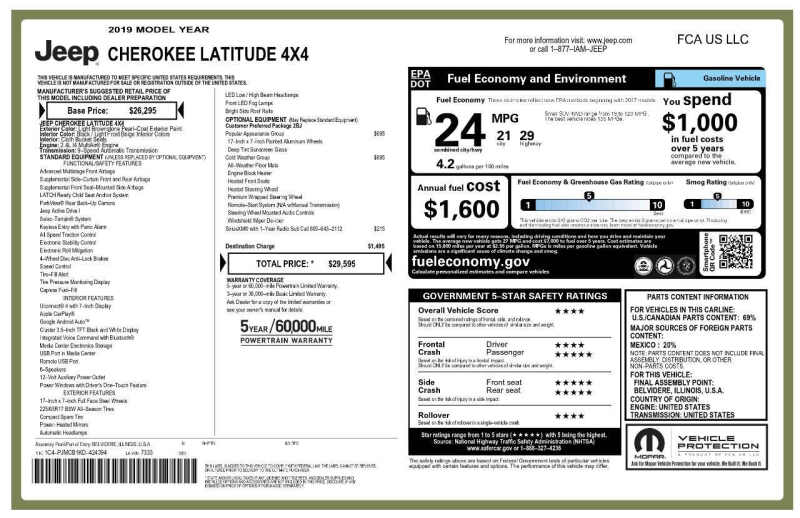This vehicle is located at our Crystal location. If youre seeking a more stylish SUV the 2019 Jeep Cherokee Latitude is worth a look. The 2019 Jeep Cherokee is a good five-seat SUV for those seeking off-road adventures. Powered by a 2.4L I4 engine gives plenty of power while maintaining 29 Highway MPG. It comes in a Latitude Plus trim level including cloth heated seats, a heated steering wheel, BlueTooth, AUX, a 12V outlet, a backup camera, great tires and so much more! Swing by RAVMotors of Crystal to check out this hot Cherokee. Come on down to RavMotors of Crystal to test-drive our cars! We'll be happy to help you find the right car at the right price. Call for vehicle availability at 763-401-4242 or email us at ravmotorsofcrystalgmail.com. Make sure to check out our inventory at www.ravmotors.com We stand behind all of our cars. We are open from 1000 AM - 700 PM on Monday-Thursday and 1000 AM - 600 PM on Friday-Saturday.