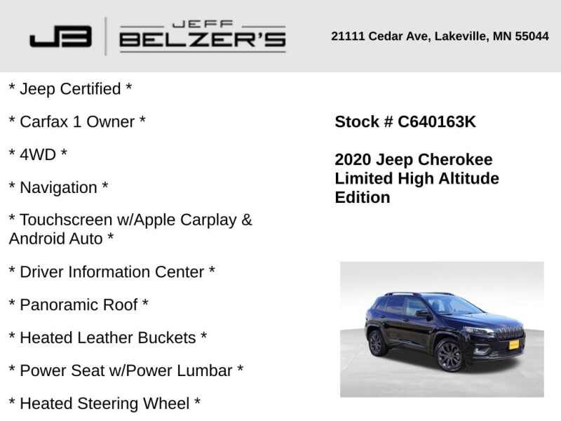 * Jeep Certified * Carfax 1 Owner * 4WD * 8.4-Inch Navigation Touchscreen w/Apple Carplay & Android Auto * Driver Information Center * Panoramic Roof * Heated Leather Buckets * Power Seat w/Power Lumbar * Heated Steering Wheel * Blind Spot * Rear Cross Path Detection * Lane Departure Warning * Autonomous Emergency Braking * Full-Speed Forward Collision Warning * Lane Keep Assist * Bluetooth Hands Free * Cruise Control * Remote Proximity Keyless Entry * Remote Start * 19 Inch Alloy Wheels * Push Button Start * Power Liftgate * Dual-Zone Automatic Climate Control * Rear Camera * Satellite & HD Radio *
