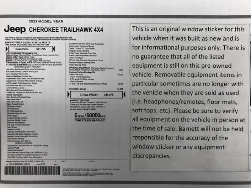 Listed selling price includes a $1000 Barnett Trade Bonus. Trade-in vehicles no more than 10 years old and 100K miles or less with a clean title automatically qualify. Trade-in vehicles outside these parameters need to be discussed and reviewed in person with the dealership to determine qualification.