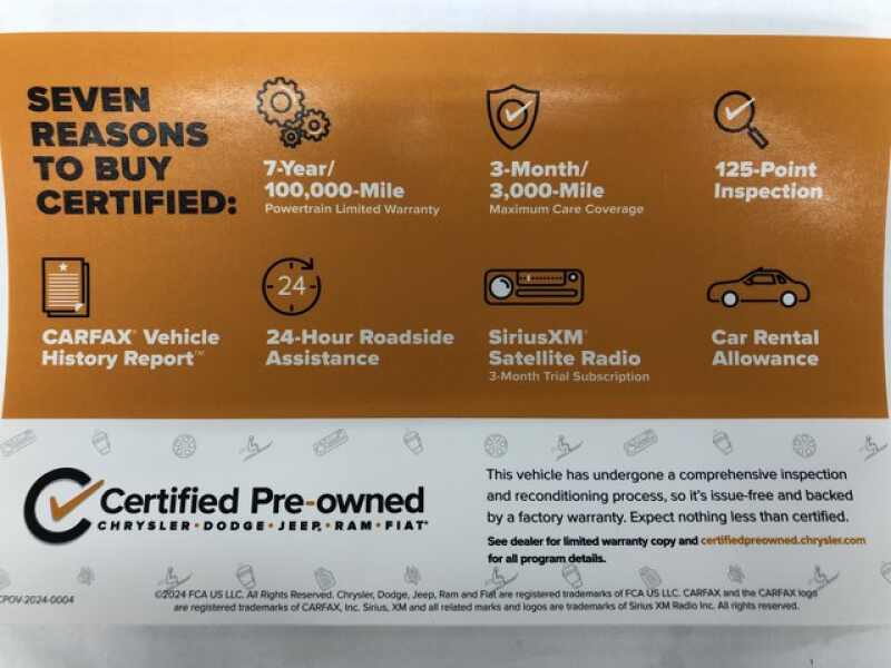 CERTIFIED PRE-OWNED!!! The vehicle underwent a 125-Point Inspection/Reconditioning process and comes with a 7-Year/100K mile factory powertrain warranty, along with a 3-month/3K mile factory Maximum Care Warranty! (If the vehicle is still under the original factory 3-year/36K mile warranty, that would run concurrent with the 3-mo/3K mile warranty). Also included at no extra cost is 24 Hour Roadside Assistance, Car Rental Allowance, and a 3-month SiriusXM Satellite Radio trial.