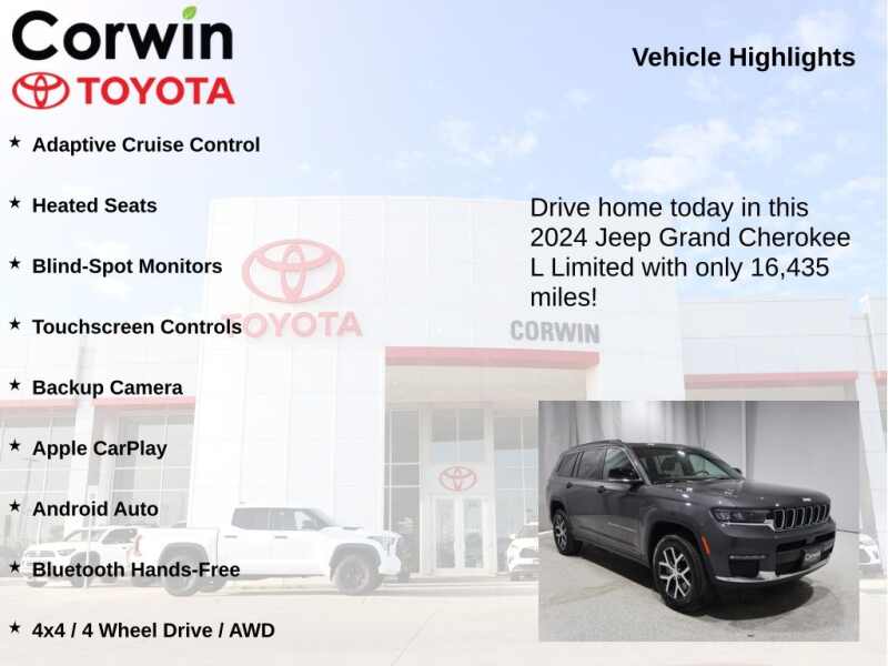 This Jeep Grand Cherokee L is well equipped and includes the following features and benefits, Adaptive Cruise Control, Heated Seats, Blind-Spot Monitors, Touchscreen Controls, Backup Camera, Apple CarPlay, Android Auto, Bluetooth Hands-Free, 4x4 / 4 Wheel Drive / AWD, Power Liftgate. Odometer is 13355 miles below market average!